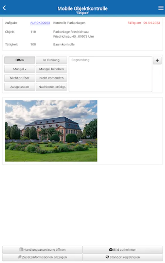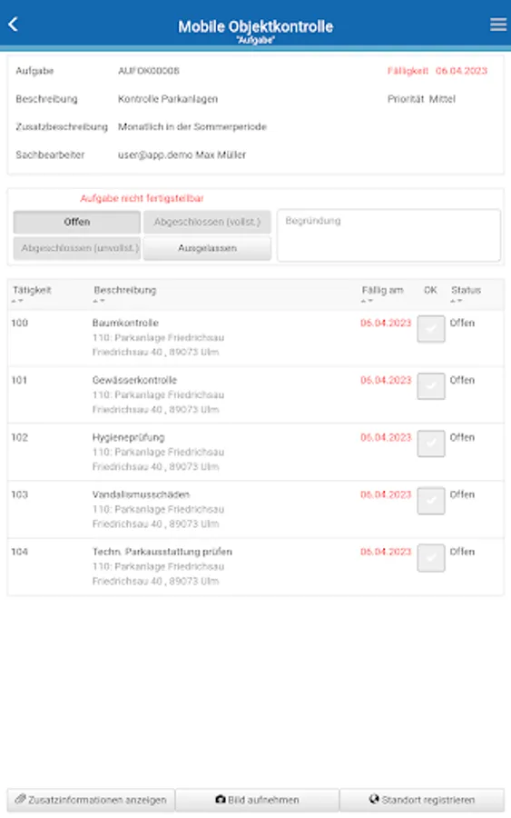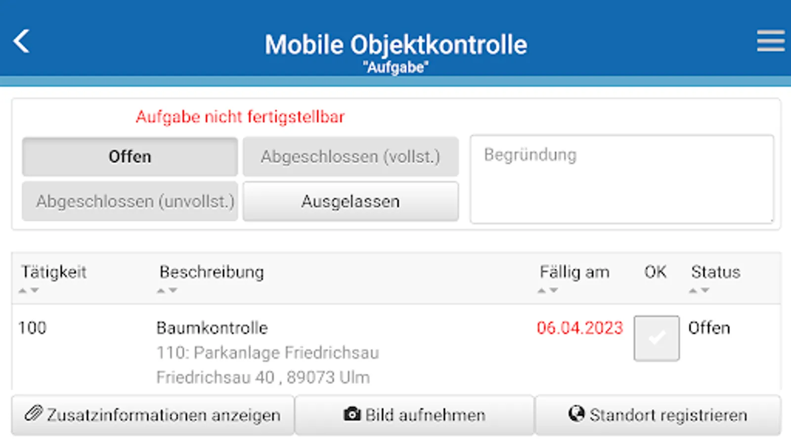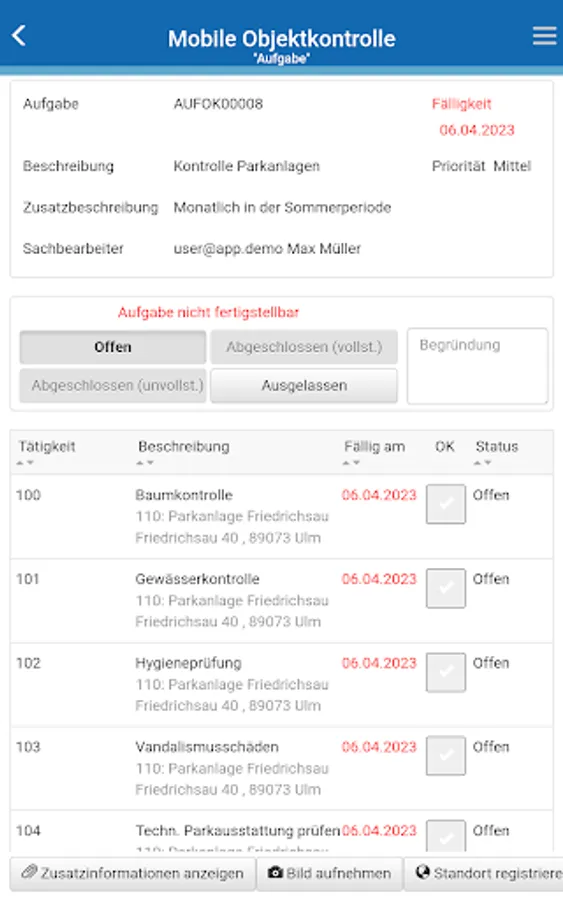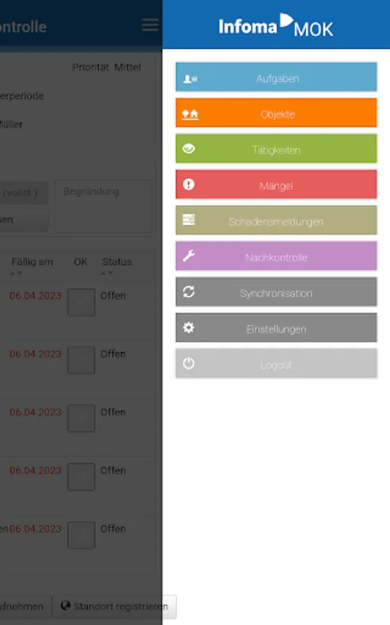 Our "MOK App" (mobile property control) enables you to process your control tasks directly on site and to report completion. The app ensures that tasks and activities are passed on to those responsible for them in a targeted manner, thereby enabling fast, error-free documentation directly and promptly on site. The tasks and activities can also be enriched with valuable additional information - e.g. photos, GPS coordinates or variable notes.