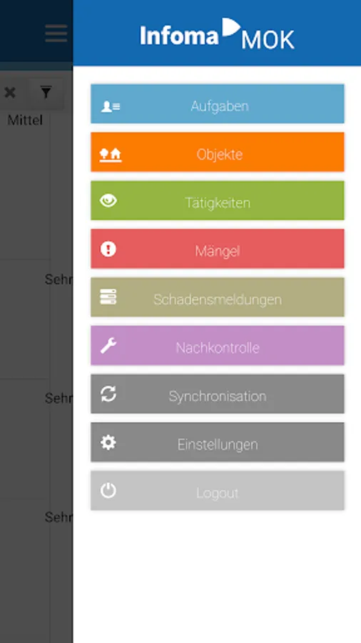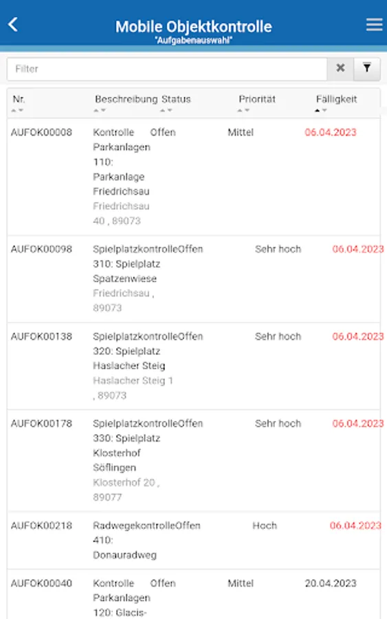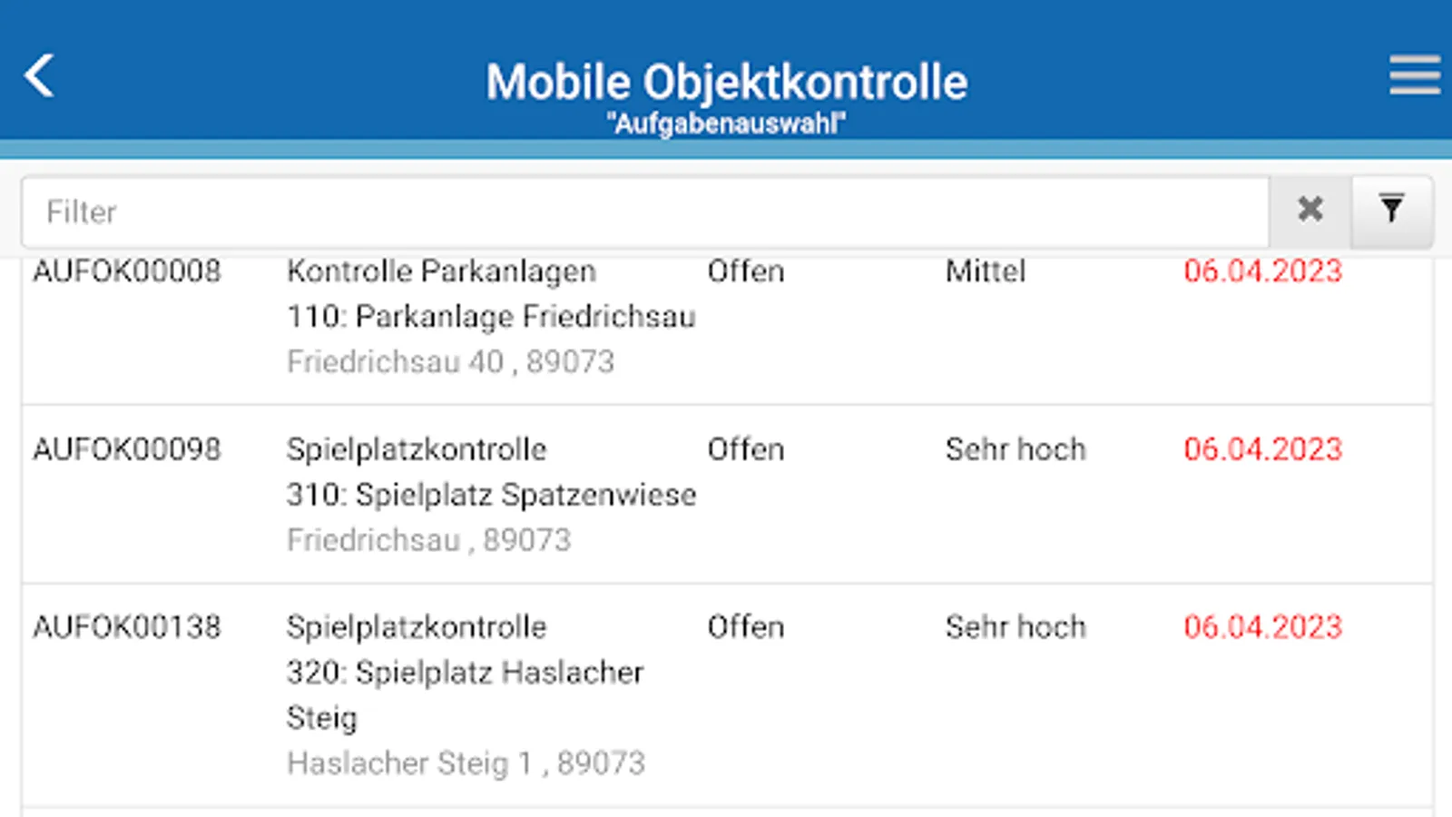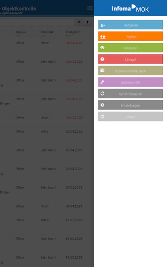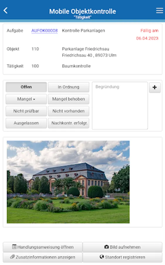 Our "MOK App" (mobile property control) enables you to process your control tasks directly on site and to report completion. The app ensures that tasks and activities are passed on to those responsible for them in a targeted manner, thereby enabling fast, error-free documentation directly and promptly on site. The tasks and activities can also be enriched with valuable additional information - e.g. photos, GPS coordinates or variable notes.