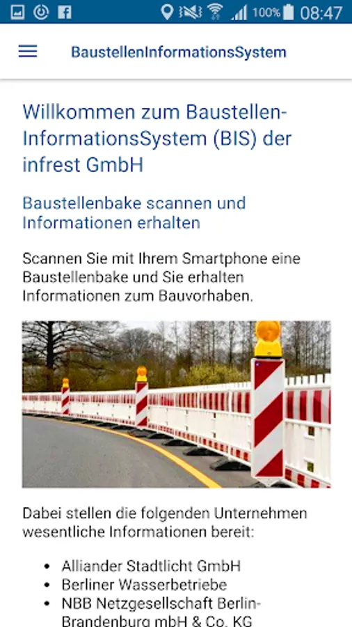 Users having to download only the app and scan a DIN standard Baustellenbake at the respective site. By positioning via GPS and site data from the construction site atlas infrest the BIS determines the respective site. such - the user of the term to be informed. As repair work on the water network - and the planned construction end. for example, water / waste water - - In these five infrastructure operators in addition, the division is and the client-site display. Where a construction site is detected, the app offers the possibility of one of the above-mentioned to contact with the work involved infrastructure operators and to submit comments and questions.