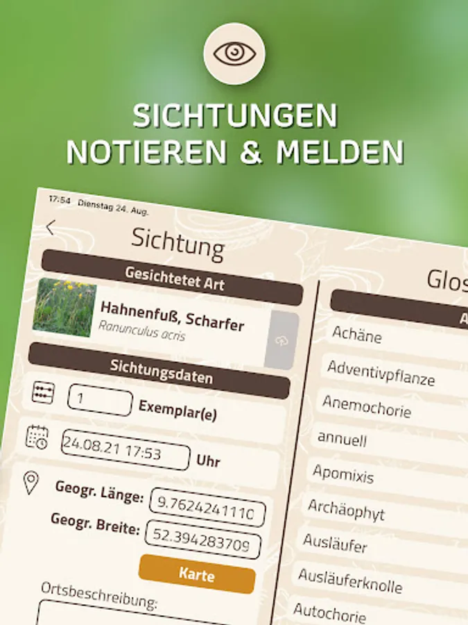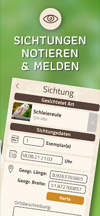 7. Reporting option: The identified species can be saved via a sighting list with GPS coordinates, photos and other information.