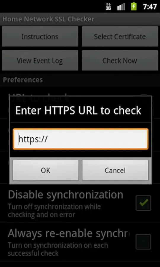 When checking and when an error happens, the global synchronization setting is turned off. This way you should be reasonably safe that the synchronization does not try to connect to a server whose identity is not verified, given it is the same server as the one you check.