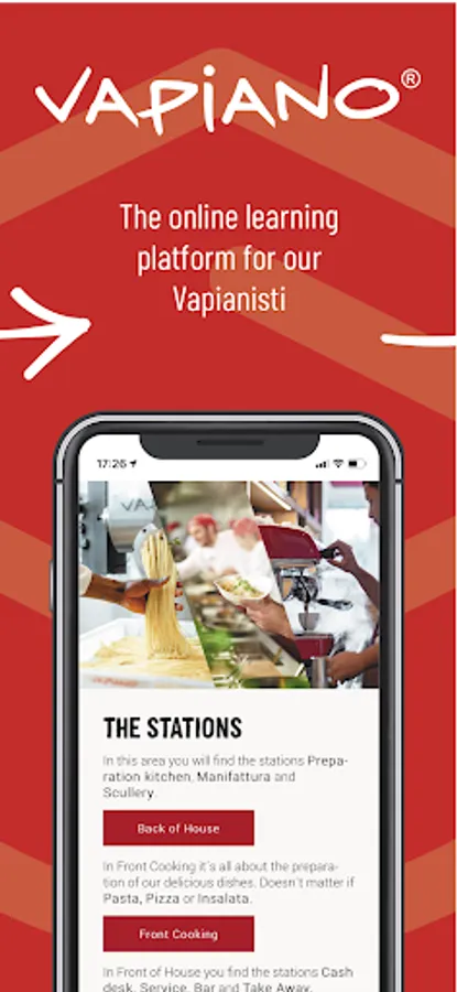 The Vapiano culture & our history, our values, recipes, training cards with short videos, tests to strengthen what you have learned, news about Vapiano worldwide and much more - all this is waiting for you in our app where you can save your learning progress.