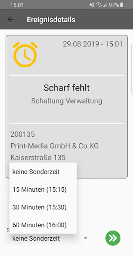 Passing a sharp-missing alarm event with the decision of the user's treatment and the possibility of establishing an extension of the disarmed state.