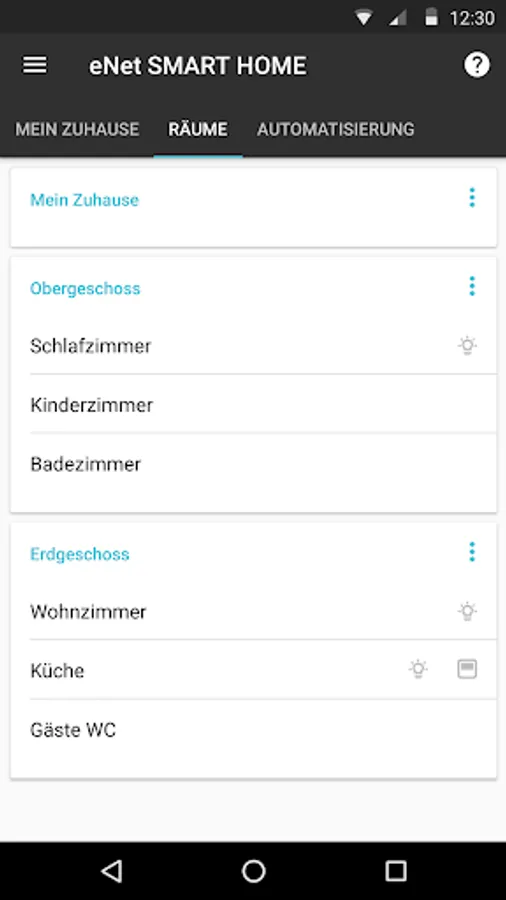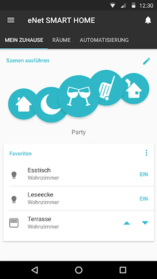 With the app, you can control your intelligent home and make all the settings for eNet SMART HOME there – from anywhere. Control light, venetian blinds and other functions with your smartphone or tablet (Android device) via a secure connection. There is one prerequisite for this: the eNet Server with software version 2.0 or higher. For information about the update, see "update.enet-smarthome.com".