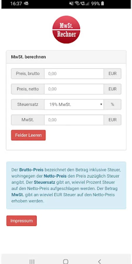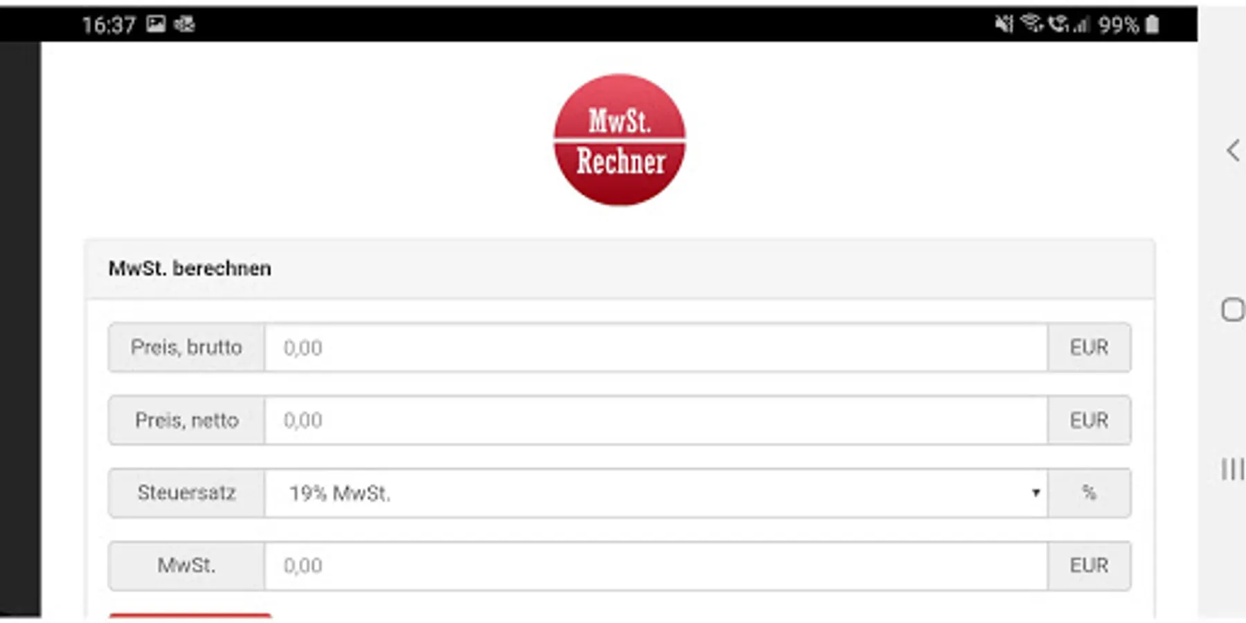 With this app you can calculate the gross and net prices for products in Germany. Choose from the tax rates 19% VAT and 7% VAT. You will see the net price, gross price and the amount of the tax in EUR.