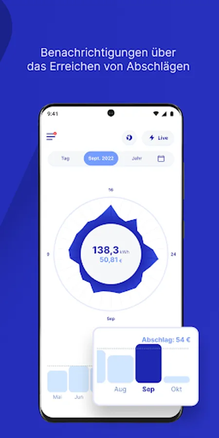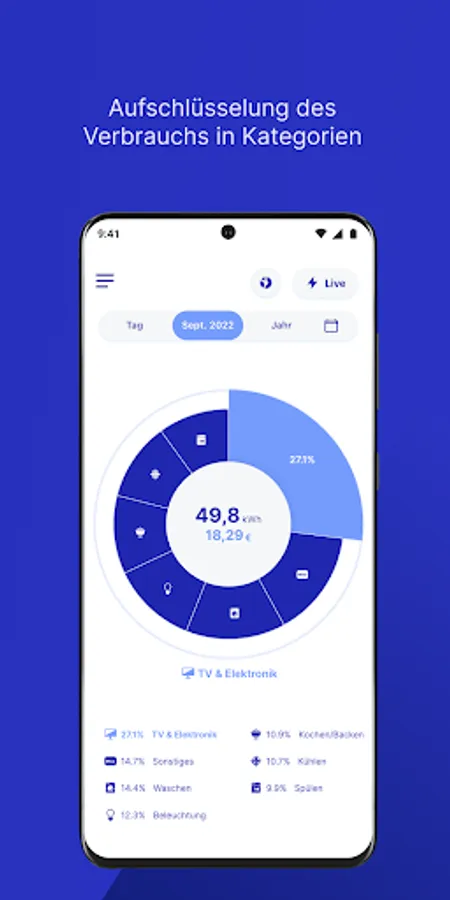 IOmeter helps you to see your daily, monthly and yearly electricity consumption and the associated costs. With the help of our advance payment warning, we inform you about your monthly advance payments. If necessary, our intelligent algorithm also analyzes your electricity consumption and gives you an overview of which consumers in your household use how much electricity in percentage terms. You can also view your current live consumption via the app.