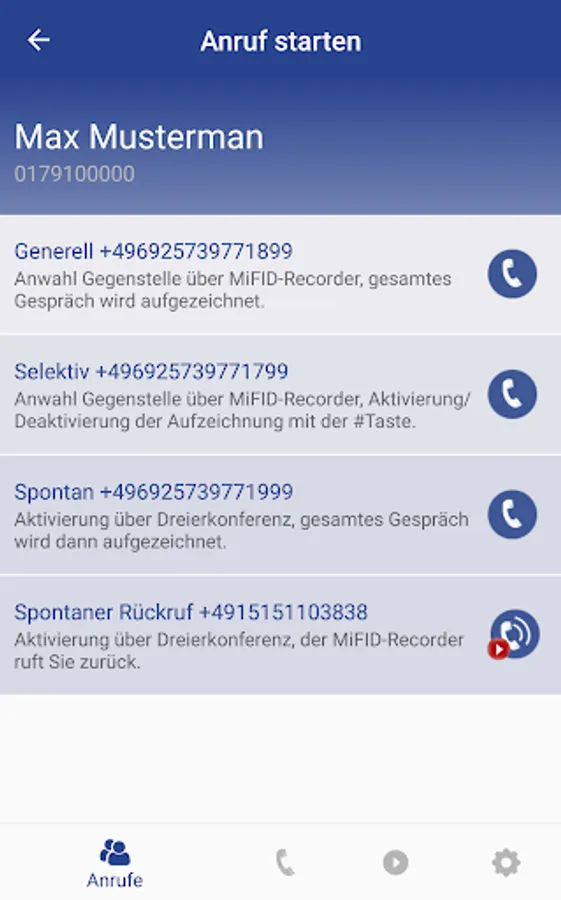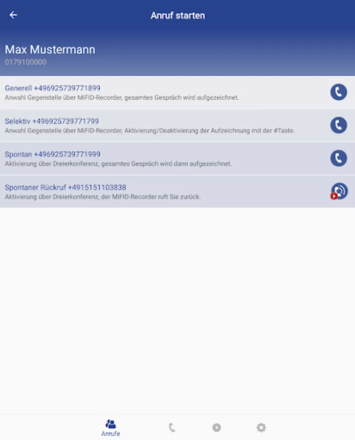Taping has never been so easy. Make calls as usual, use the usual phone book and start recording with just one click. All recordings are not stored on the mobile phone, but within the revision-proof infrastructure and can be called up at any time via the MiFID recorder web interface.