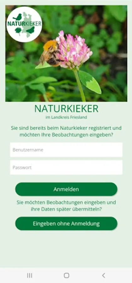 The app can also be used for pure input without creating a user account. To manage your data, it is necessary to upload the collected observations to the portal https://portal.naturkieker.de by setting up a user account.