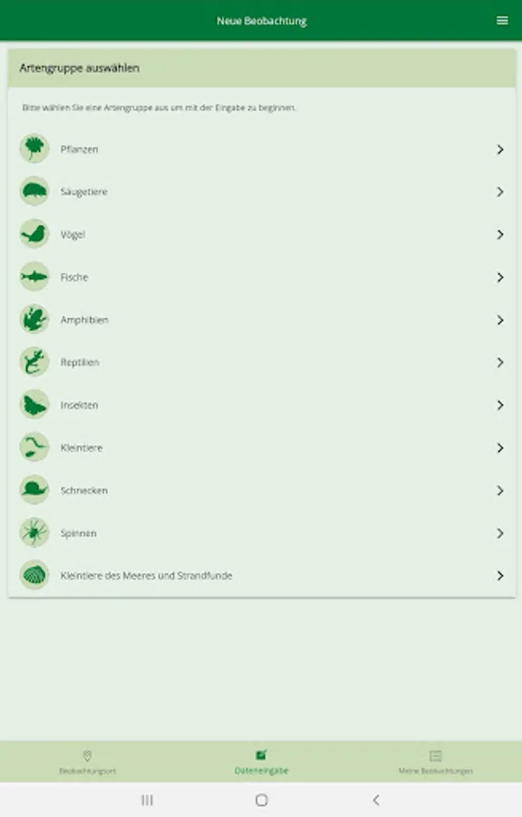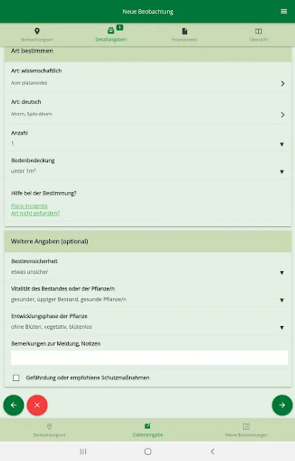 The app enables either a quick and uncomplicated input with just a few clicks for the interested layperson or the spontaneous documentation of an observation on site, as well as extensive input of additional information for the expert.