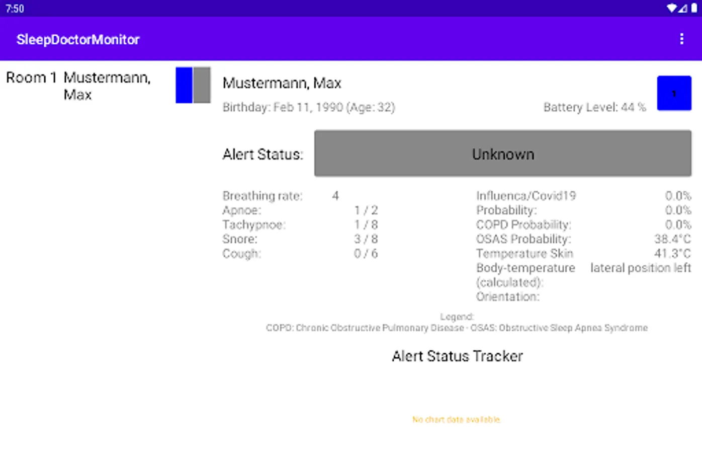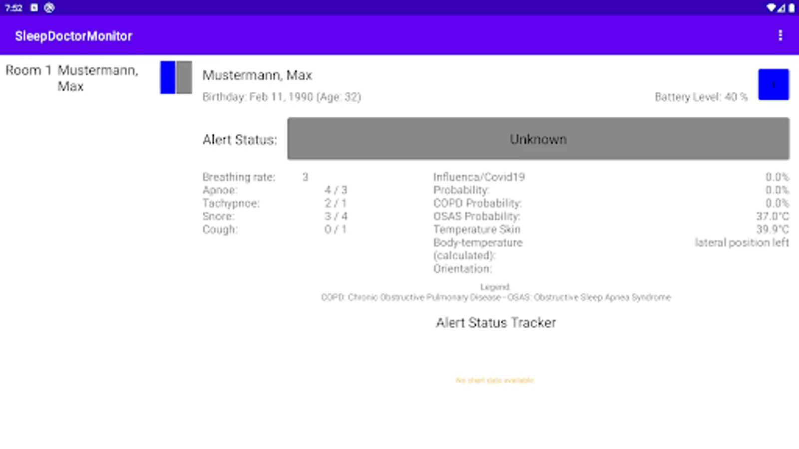The SleepDoctor® 2.0 can permanently measure a person's respiration, respiratory rate, apnea, snoring, cough, fall, tachypnea, temperature, position, pulse and oxygen saturation. The measured values are transmitted in real time to a tablet or smartphone for the user or to a comparable electronic device (e.g. PC/laptop/computer) if desired.