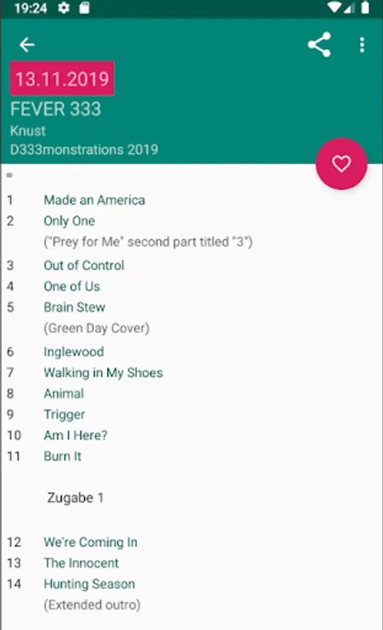 Concert setlists uses the huge community of setlist.fm - the setlist wiki. Thank you for their support. If you have setlists which you are missing on setlist.fm please give me a note or you can add it by yourself on setlist.fm. It is free for use.