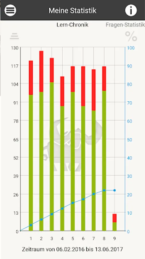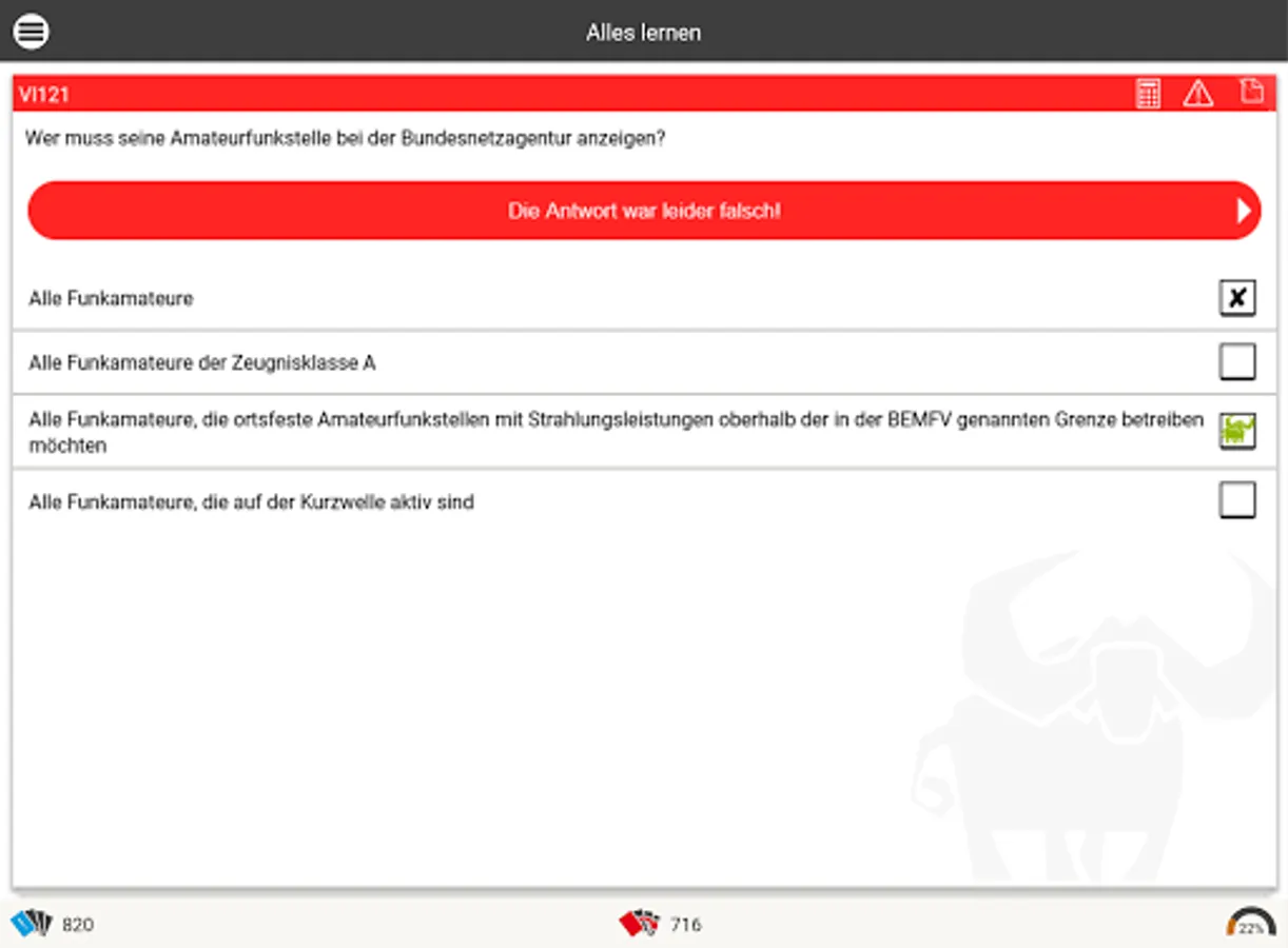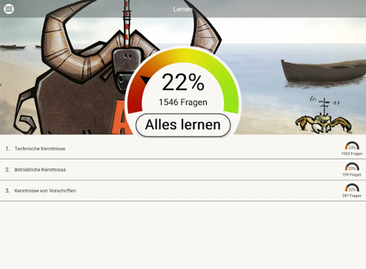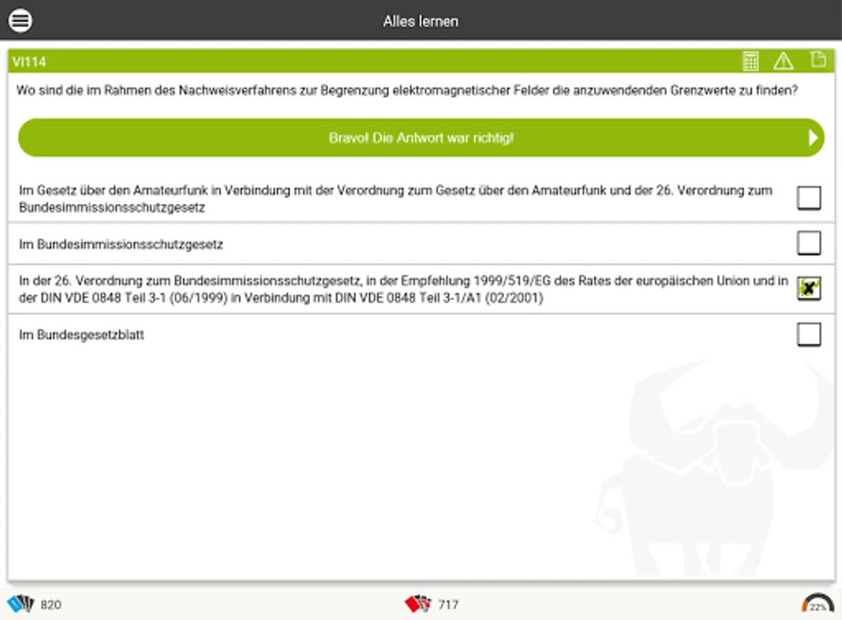 As in an intelligent index card system, the Büffeln.Net learning system repeats all exam questions from the official questionnaire. Our system will primarily repeat the questions that you have answered incorrectly until you are sure of the subject matter for your exam. The Büffeln.Net Lern-O-Meter helps you to keep a better eye on your learning progress.