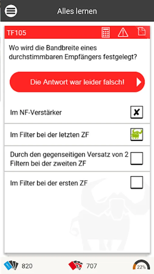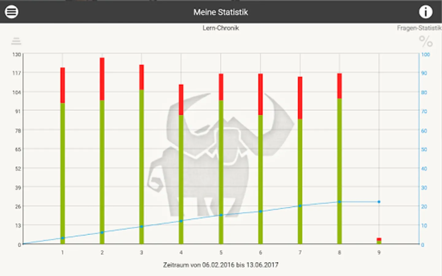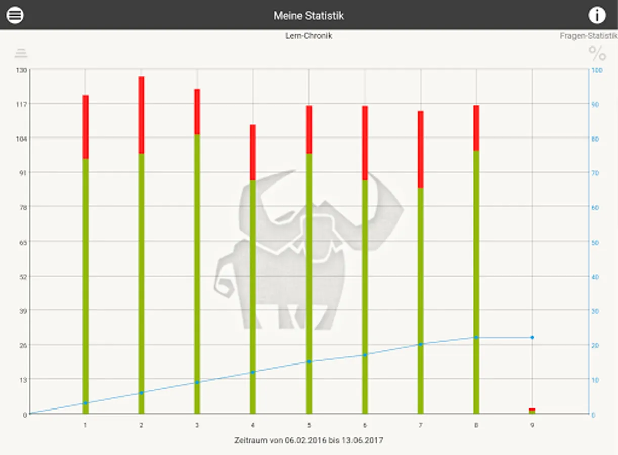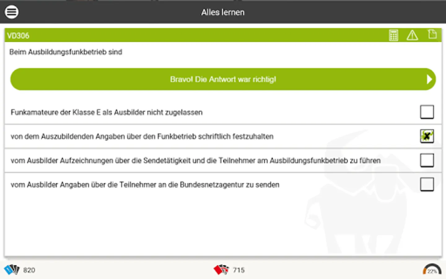 As in an intelligent index card system, the Büffeln.Net learning system repeats all exam questions from the official questionnaire. Our system will primarily repeat the questions that you have answered incorrectly until you are sure of the subject matter for your exam. The Büffeln.Net Lern-O-Meter helps you to keep a better eye on your learning progress.