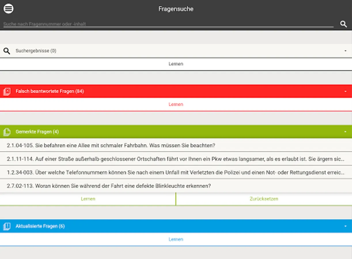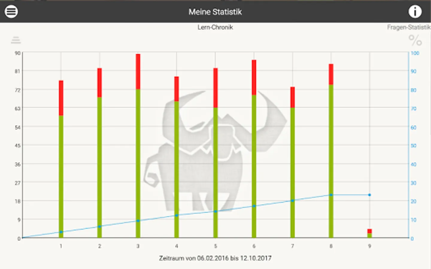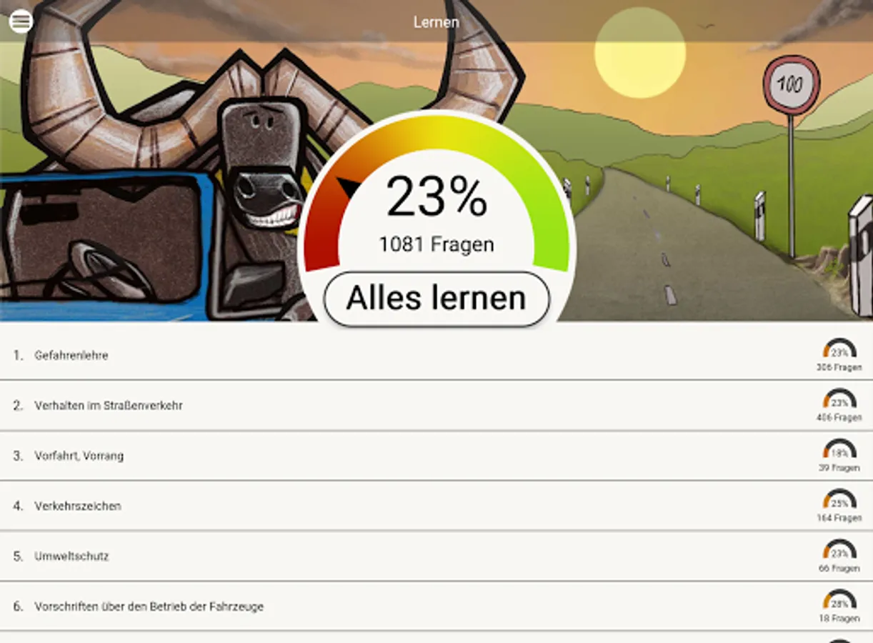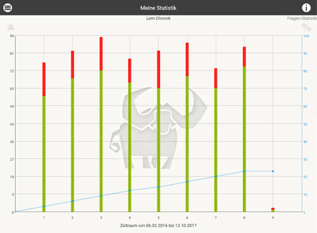 As in an intelligent index card system, the Büffeln.Net learning system repeats all exam questions from the official catalog of questions. Our system primarily repeats the questions that you answered incorrectly until you are sure about the subject matter for your exam. The Büffeln.Net Lern-O-Meter helps you to keep a better eye on your learning progress.