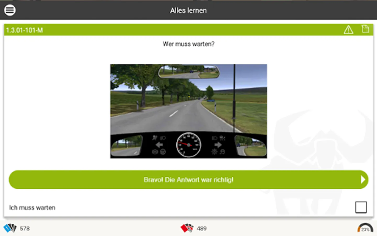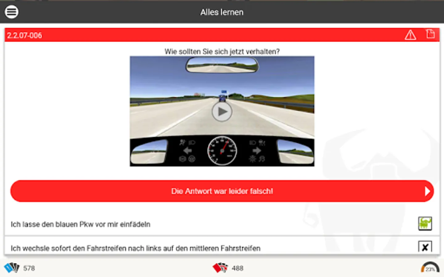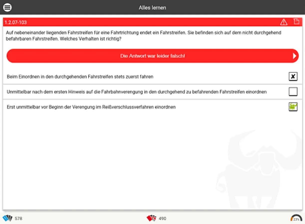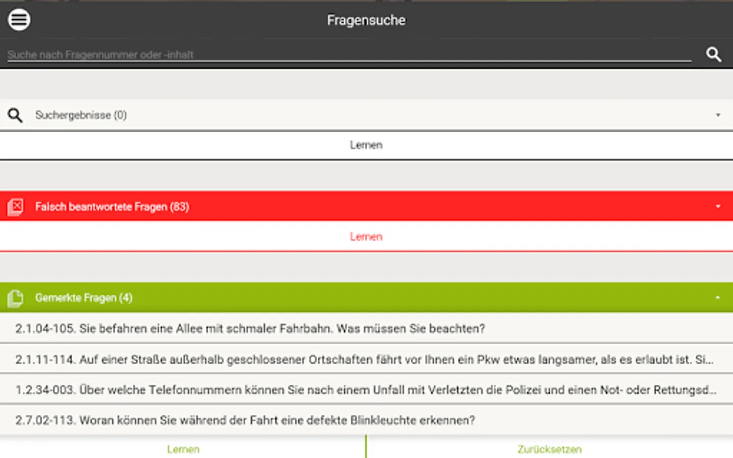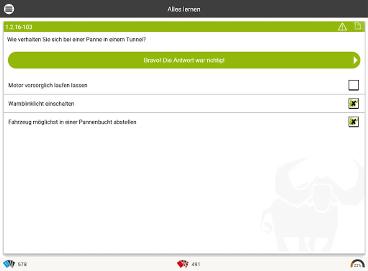 As in an intelligent index card system, the Büffeln.Net learning system repeats all exam questions from the official catalog of questions. Our system primarily repeats the questions that you answered incorrectly until you are sure about the subject matter for your exam. The Büffeln.Net Lern-O-Meter helps you to keep a better eye on your learning progress.