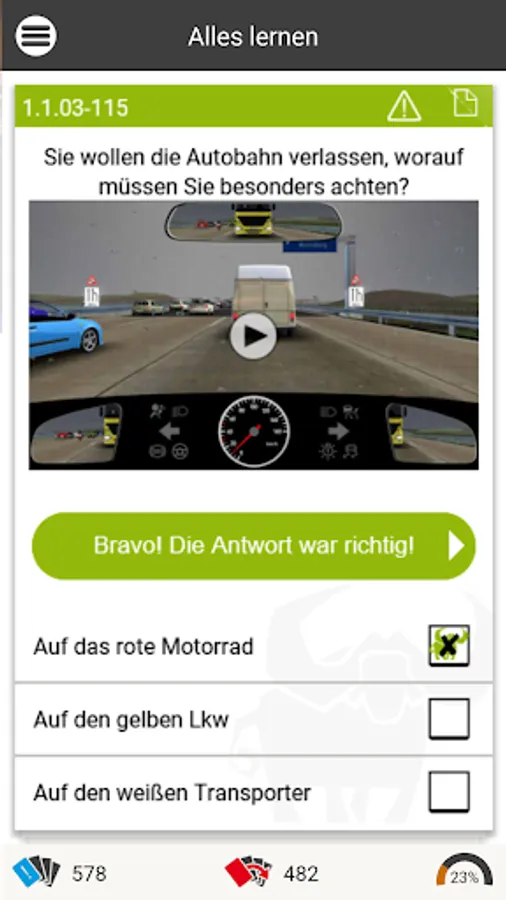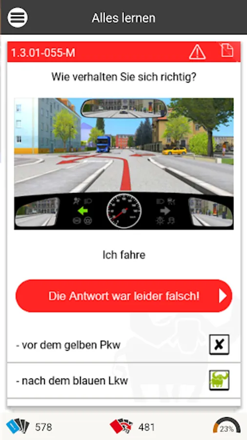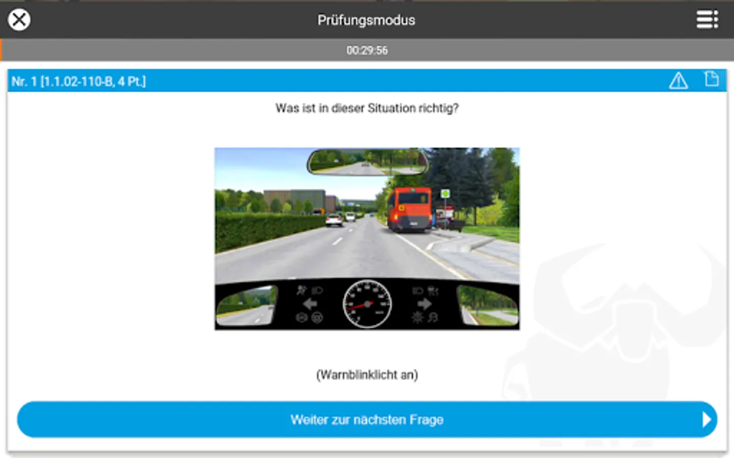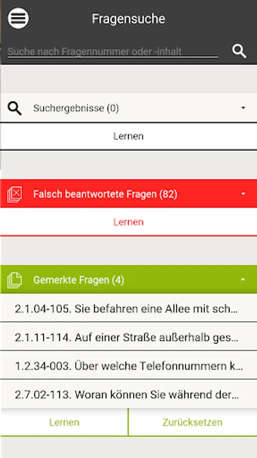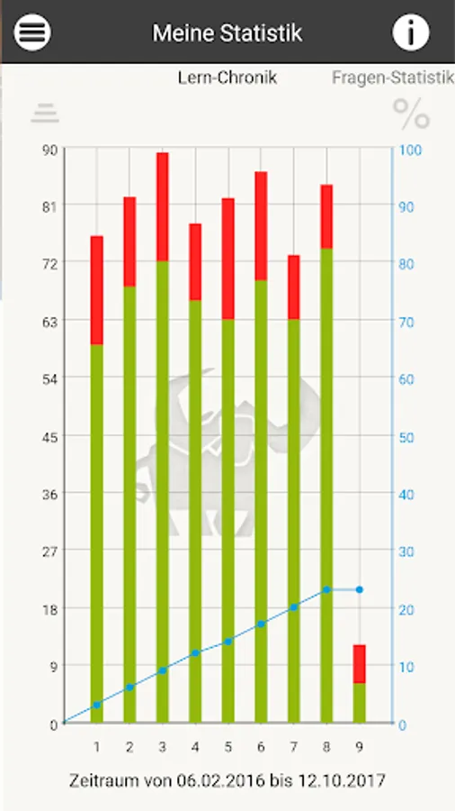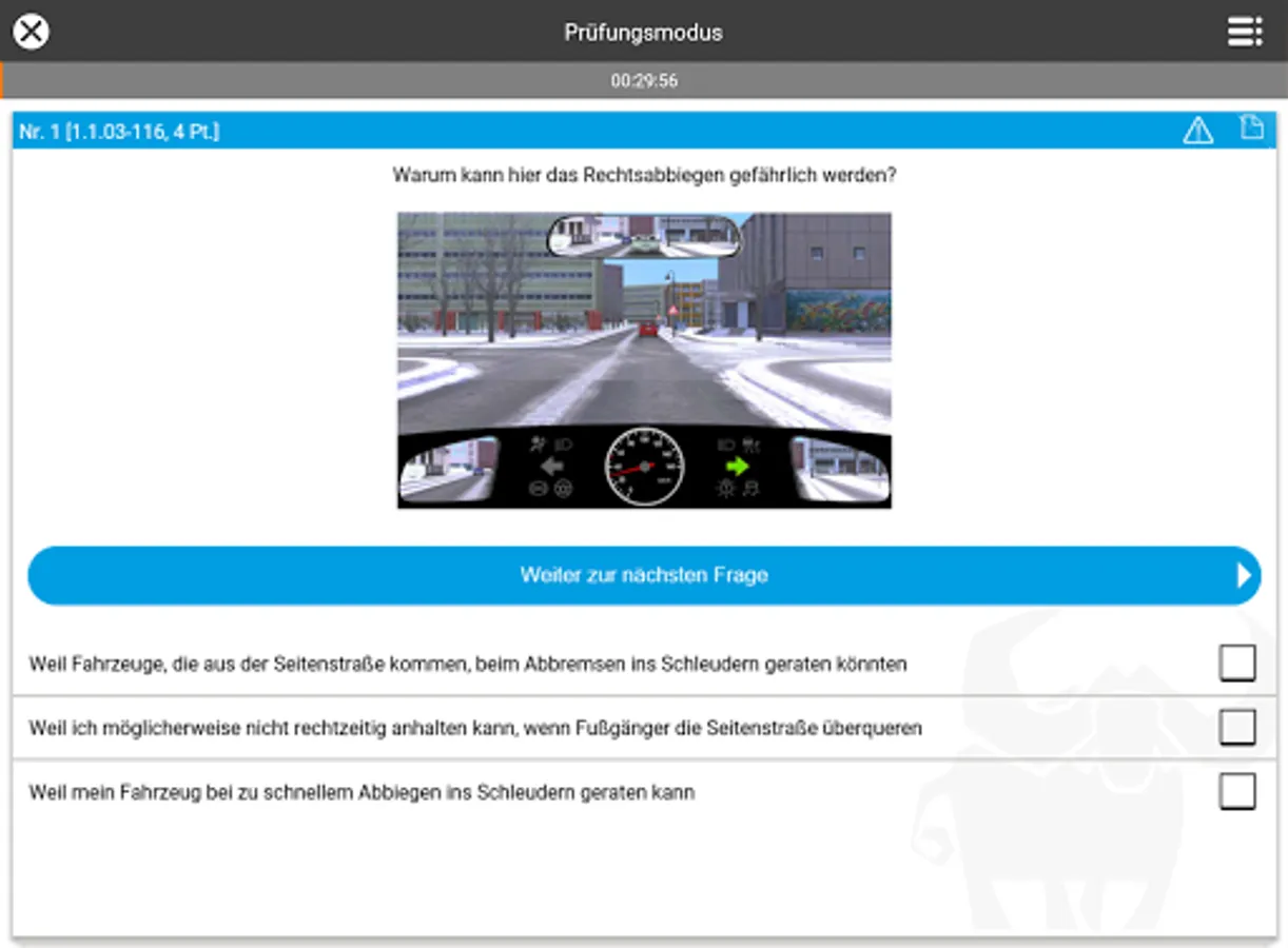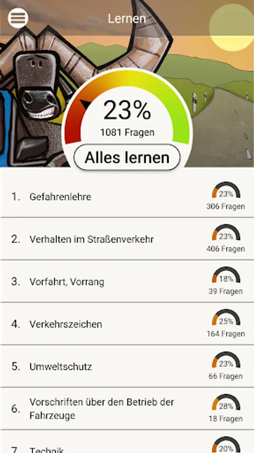 As in an intelligent index card system, the Büffeln.Net learning system repeats all exam questions from the official catalog of questions. Our system primarily repeats the questions that you answered incorrectly until you are sure about the subject matter for your exam. The Büffeln.Net Lern-O-Meter helps you to keep a better eye on your learning progress.