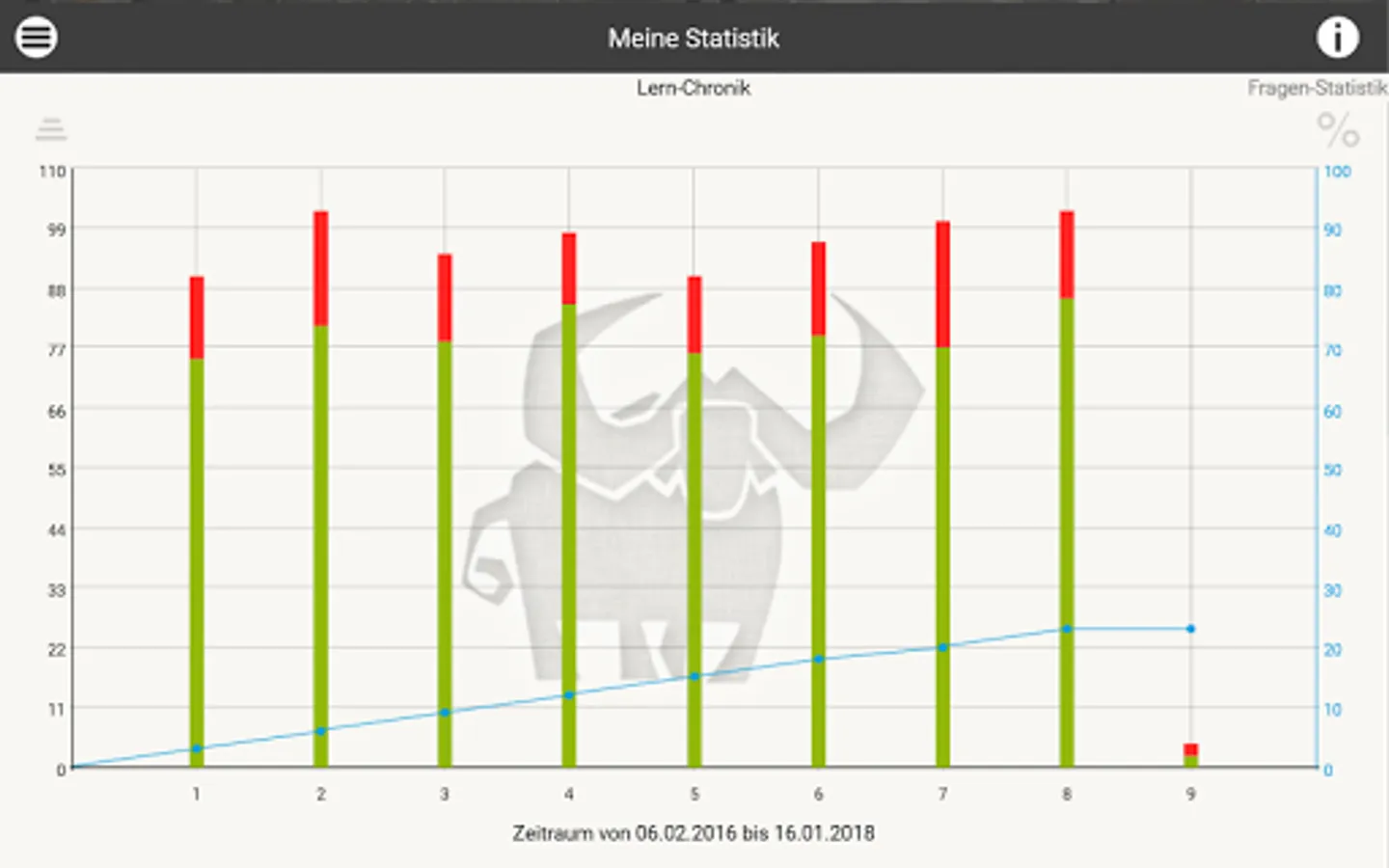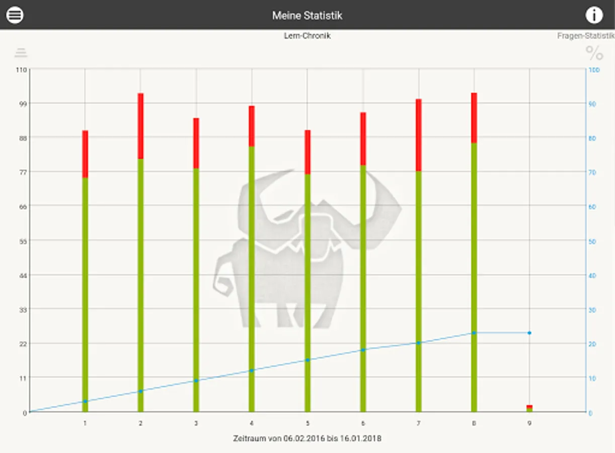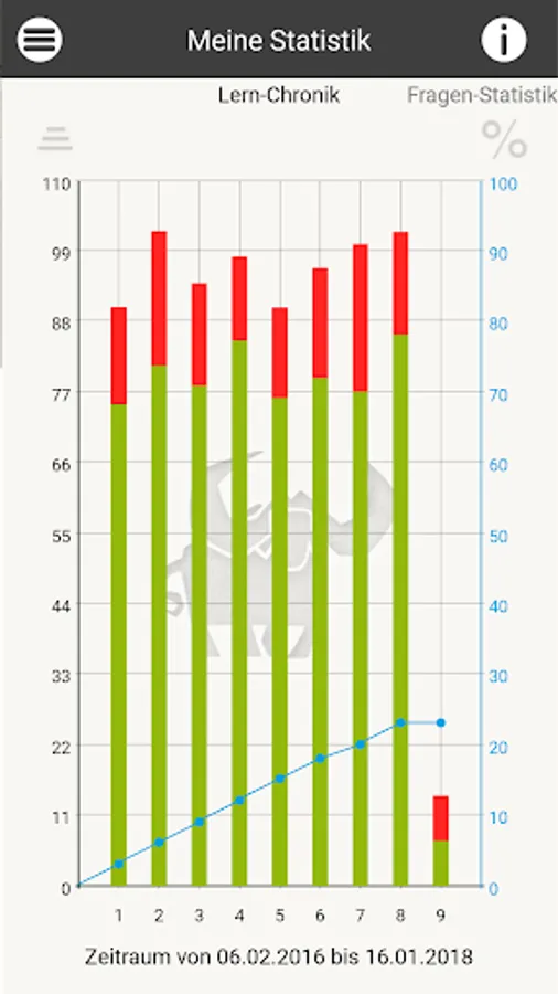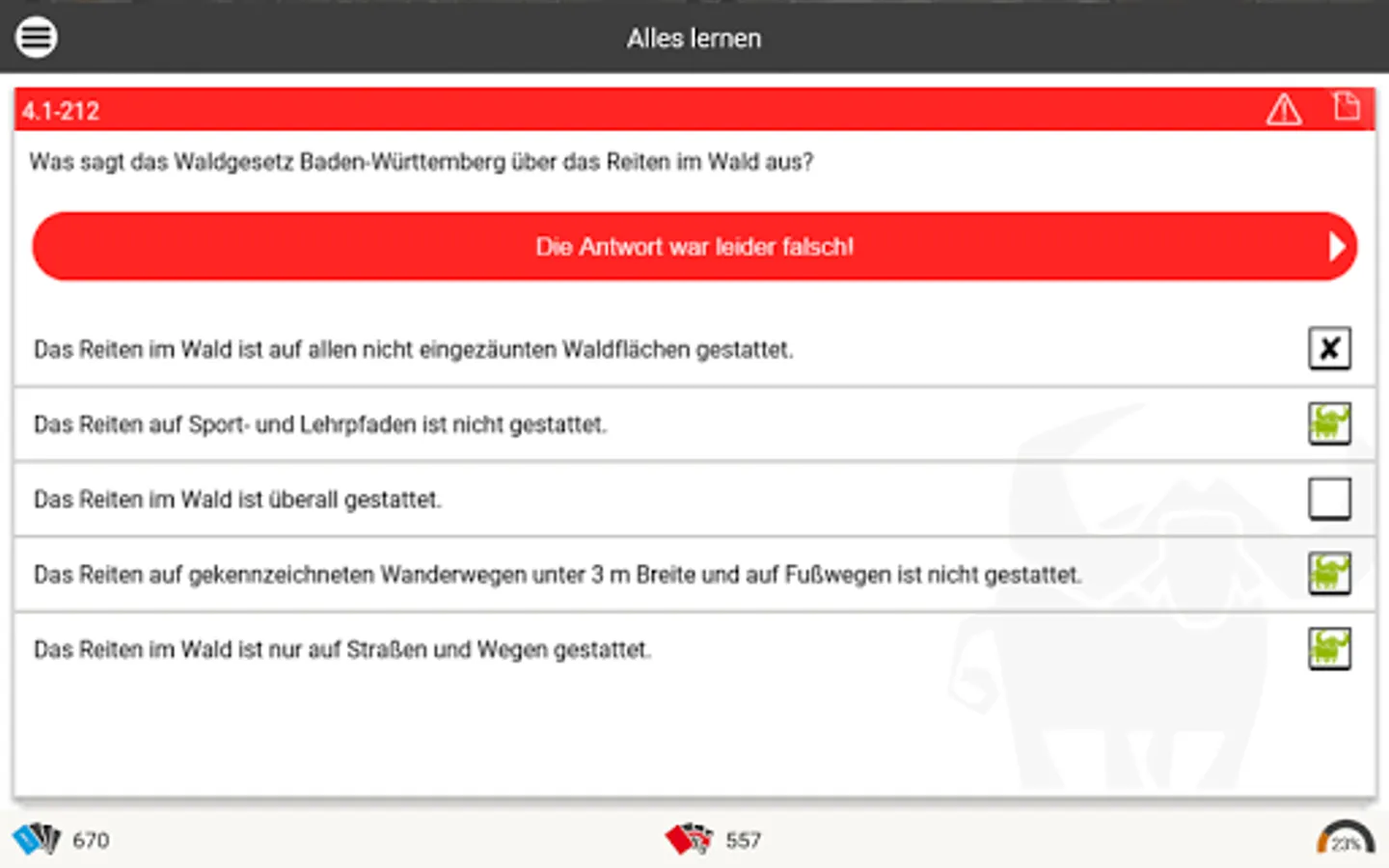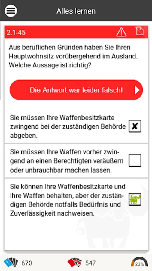 As in an intelligent index card system, the Büffeln.Net learning system repeats all exam questions from the official questionnaire. Our system will primarily repeat the questions that you have answered incorrectly until you are sure of the subject matter for your exam. The Büffeln.Net Lern-O-Meter helps you to keep a better eye on your learning progress.