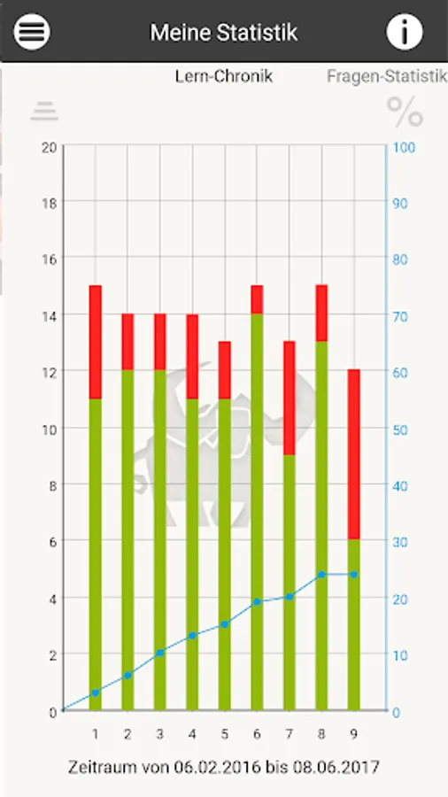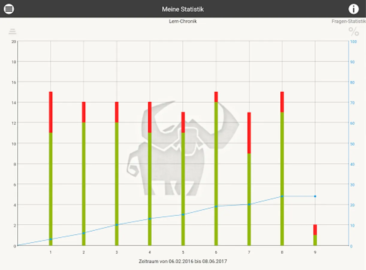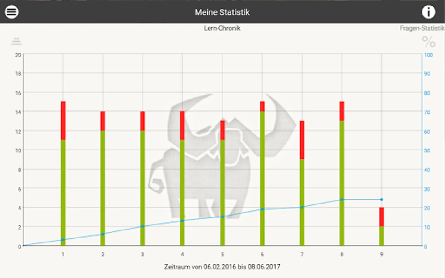 As in a smart card index system, repeated the Büffeln.Net learning system all questions. Our system repeats with priority for the questions that you answered incorrectly until you can safely learning material for your exam. The Büffeln.Net learning-O-Meter helps you to keep your study progress better in mind.