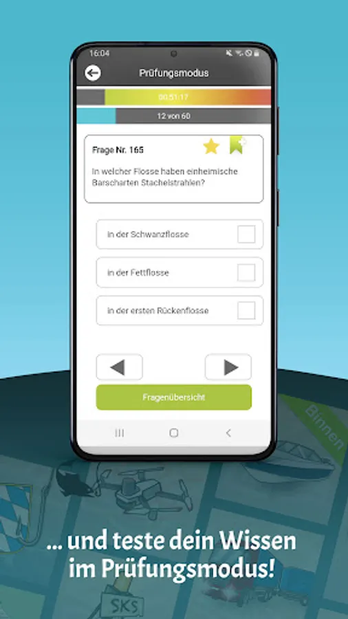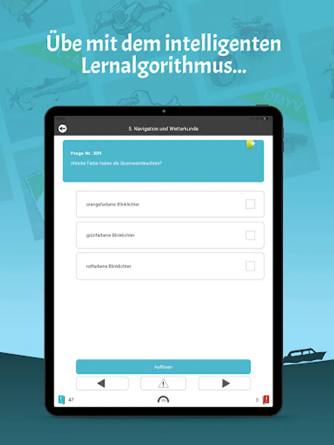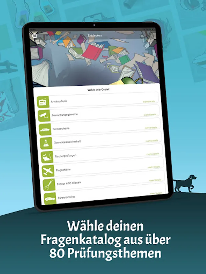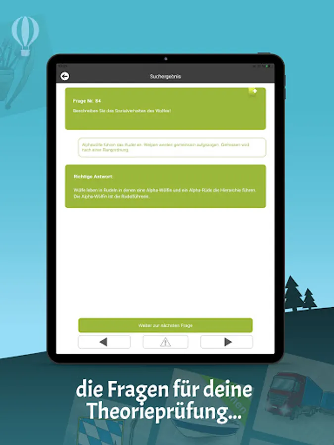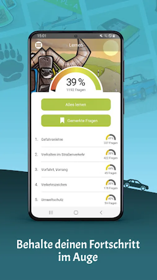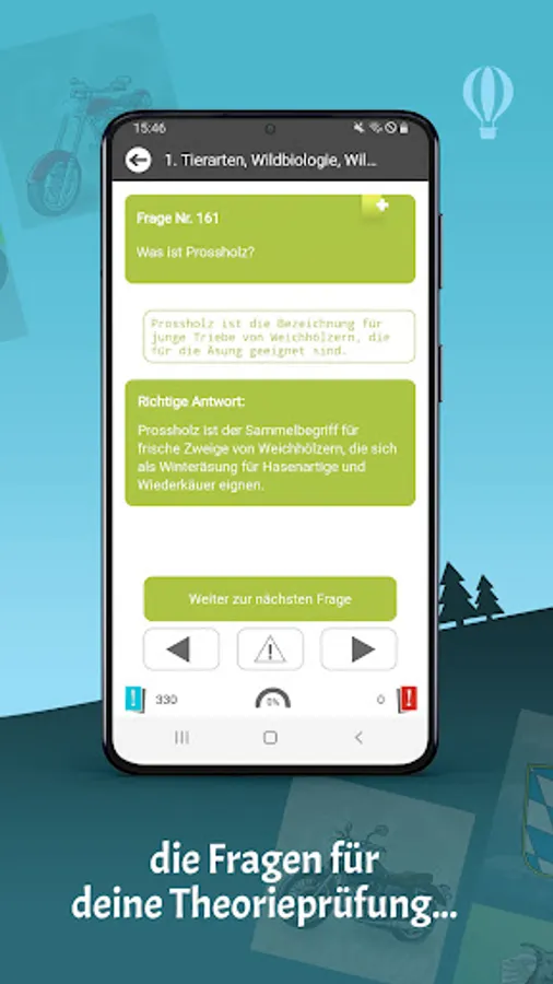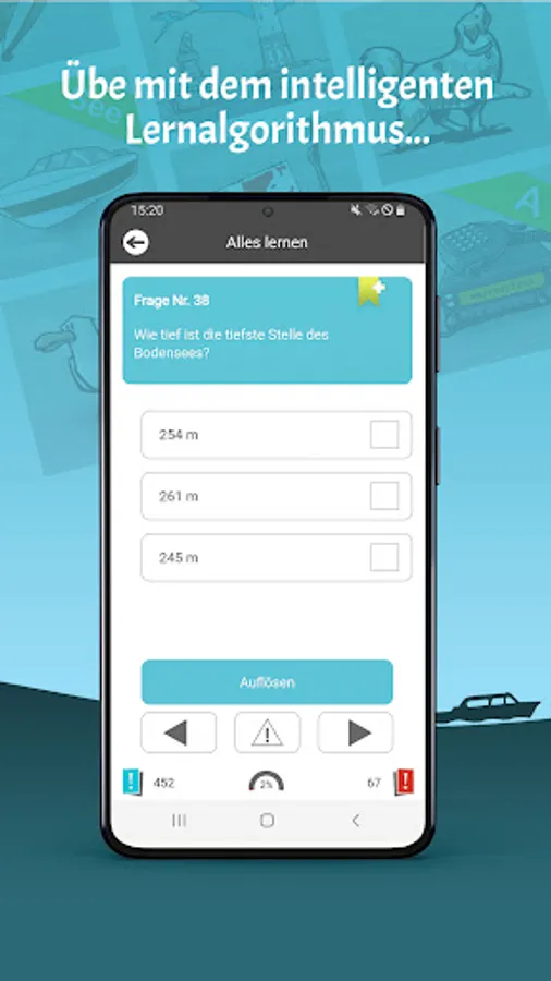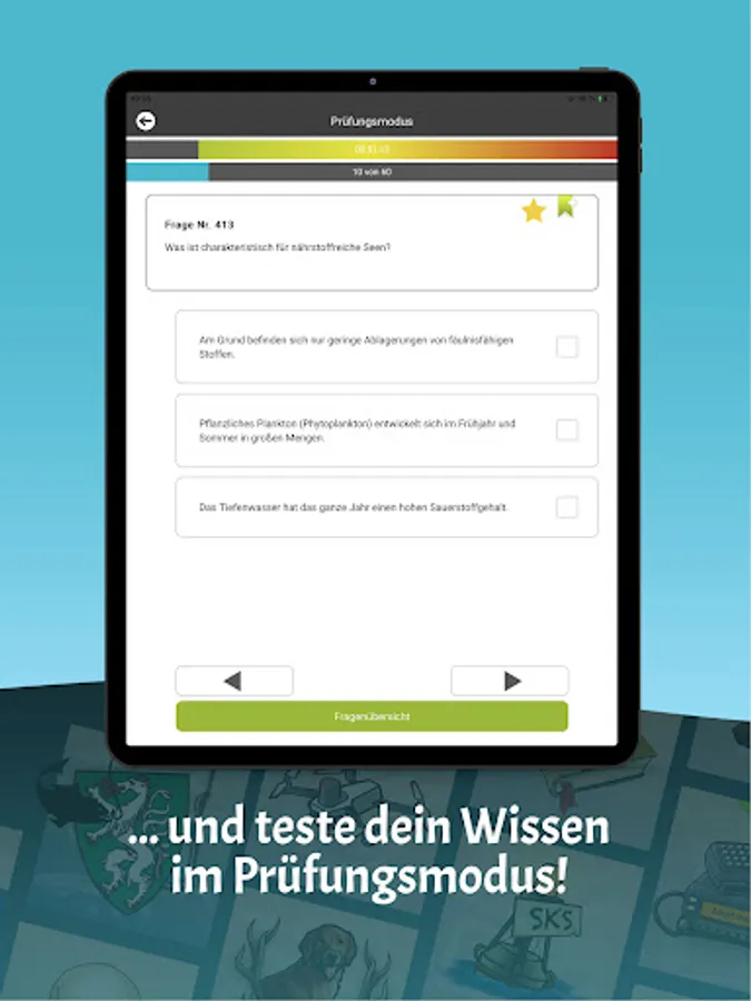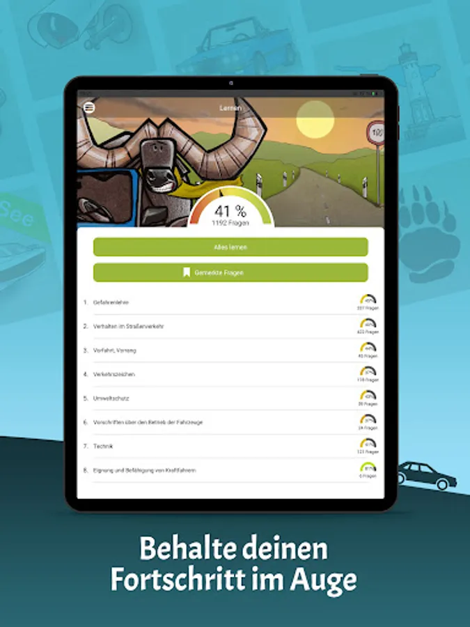 As in an intelligent index card system, our app repeats all exam questions from official questionnaires. Our system primarily repeats the questions that you answered incorrectly until you are sure about the subject matter for your exam. The Büffeln.Net Lern-O-Meter helps you to keep a better eye on your learning progress.