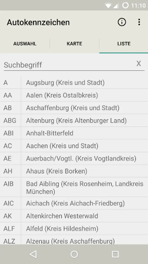 An app with the car registration of the Federal Republic of Germany. A list of license numbers to search. A search for a particular indicator. In addition, you will be the geographical location on the map.