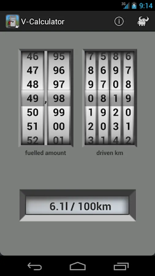 This application is a great help in calculating the fuel consumption per 100km.