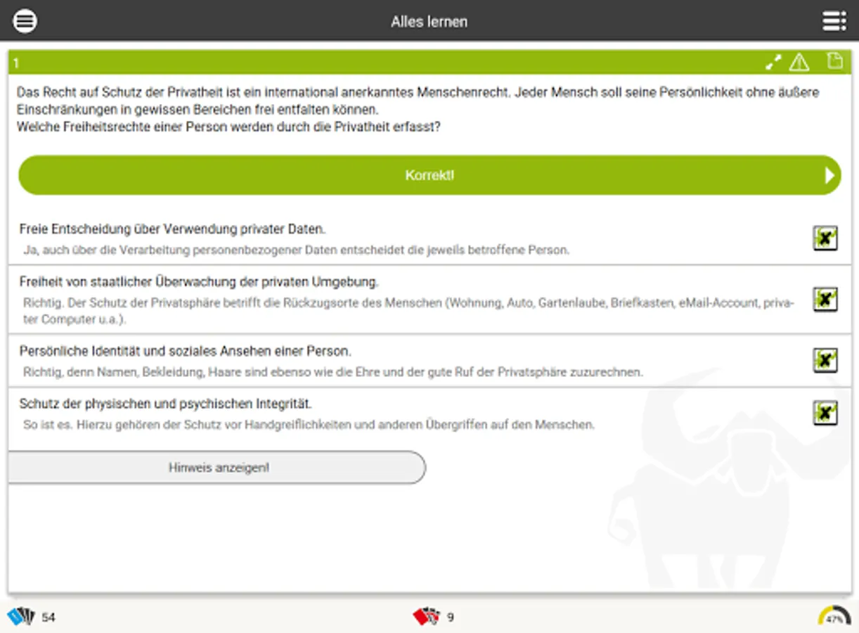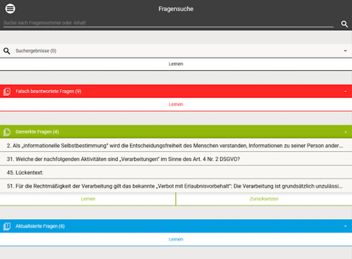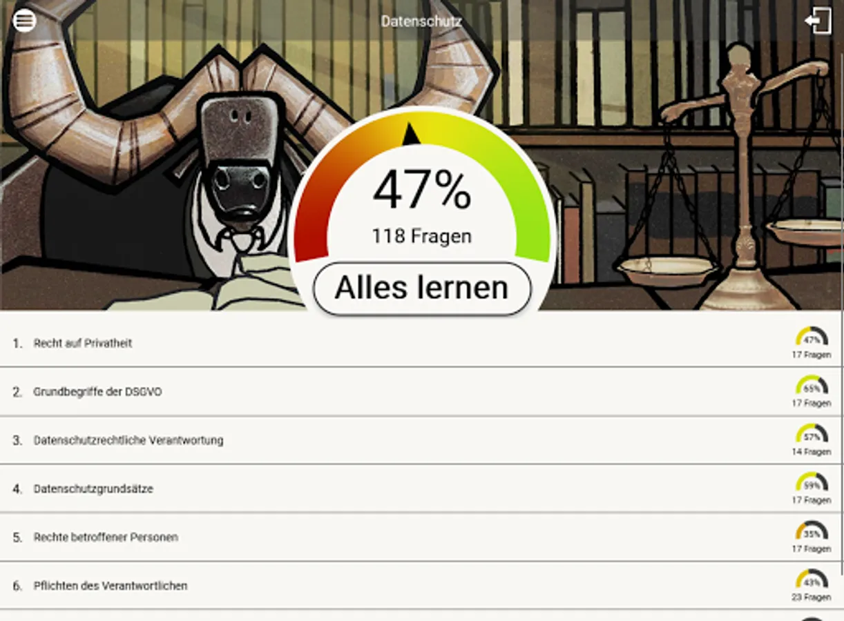 This app contains legal exercises (multiple choice, assignment tasks, cloze texts) around the data protection right (right to privacy, EU-DSGVO, data protection management, special processing situations, the research privilege u.v.m.). It is suitable for both practice and study.