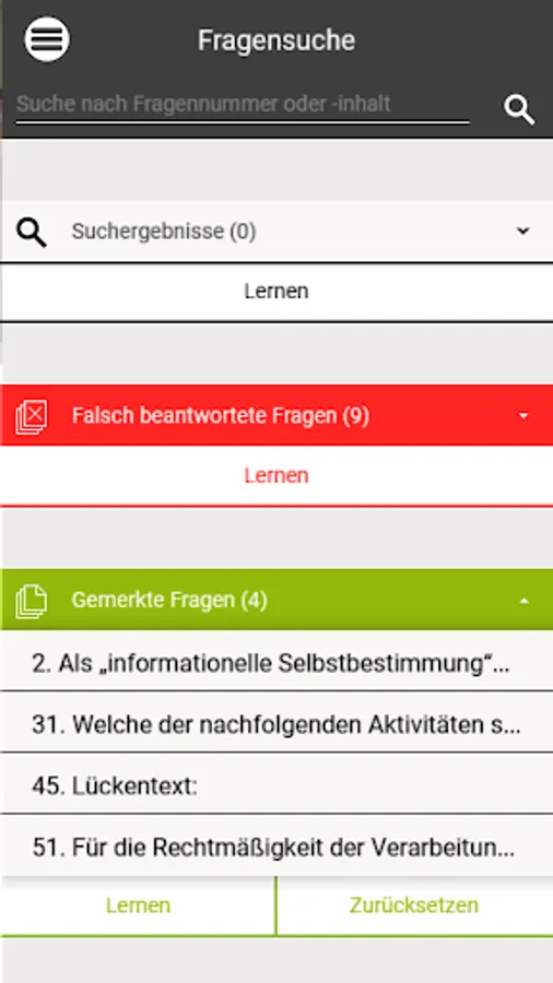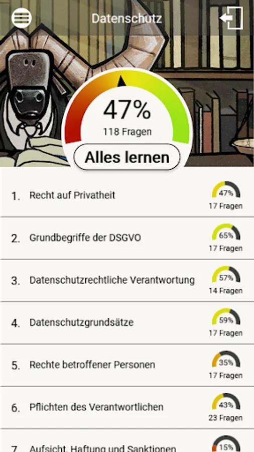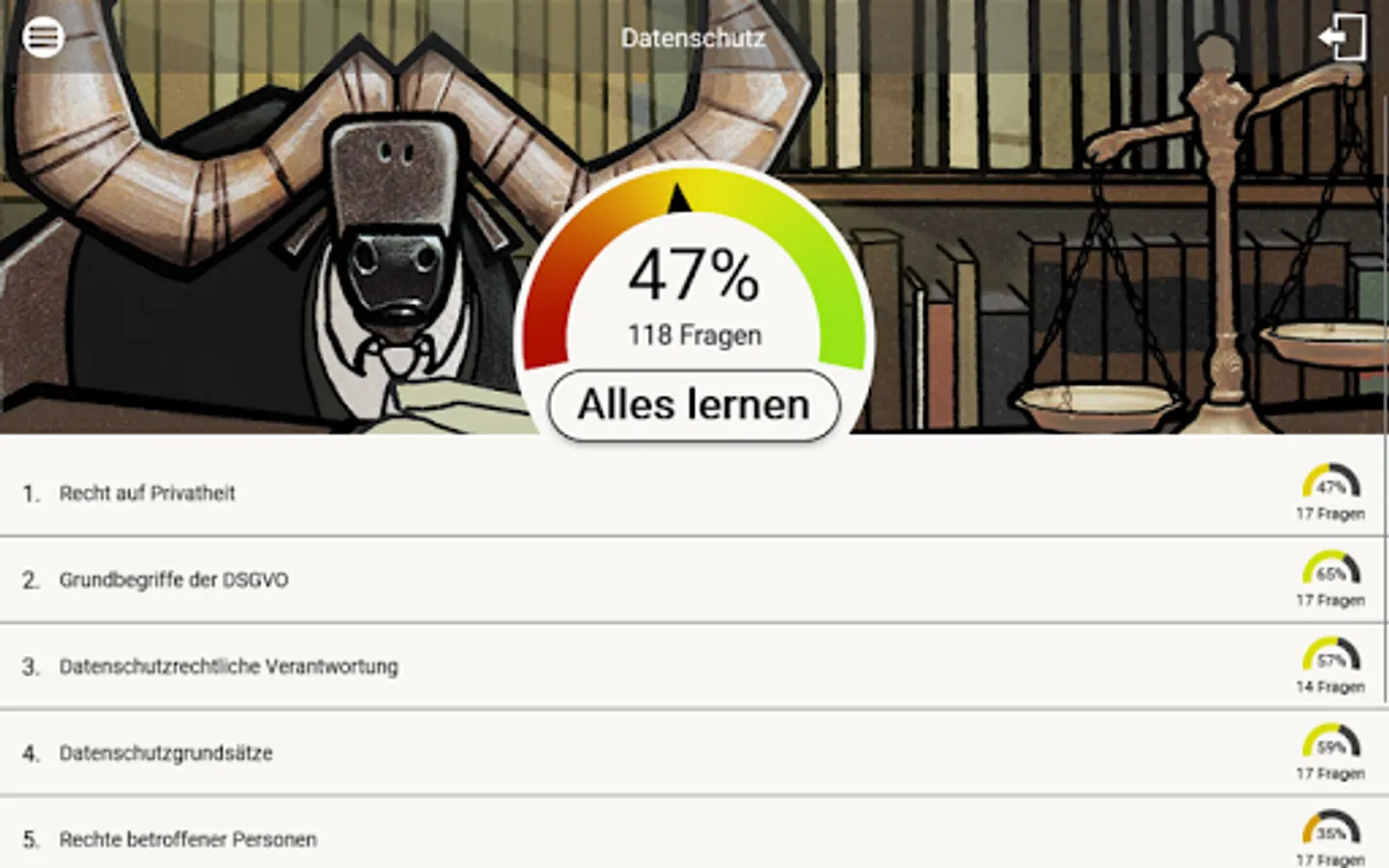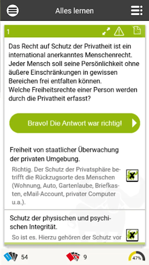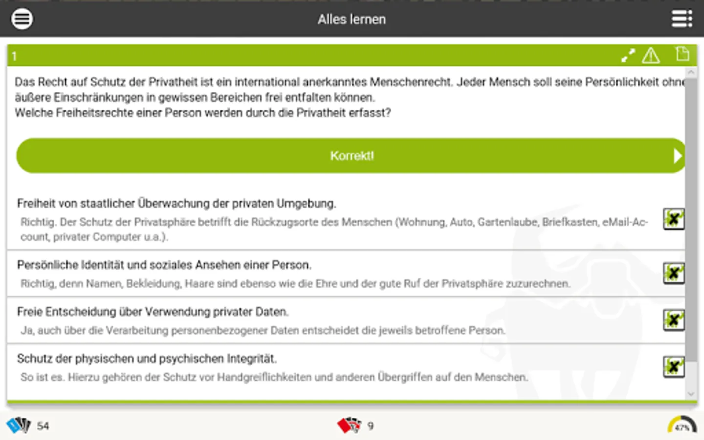 This app contains legal exercises (multiple choice, assignment tasks, cloze texts) around the data protection right (right to privacy, EU-DSGVO, data protection management, special processing situations, the research privilege u.v.m.). It is suitable for both practice and study.