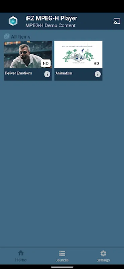 Reproducing high-quality MPEG-H Audio content is now much easier with the iRZ MPEG-H Player App. The application provides multiple features to easily and comfortably play back MPEG-H Audio Streaming content via using a compatible Google Chromecast device, a connected MPEG-H enabled soundbar or an AVR. In order to enjoy the full sound spectrum of the possibilities offered with MPEG-H you simply access your content with the iRZ MPEG-H Player App from the local storage of an Android device or add a media source that is located on your server to the In-App selection options. Please contact us on support@i-rz.de for instructions on defining your own media source.