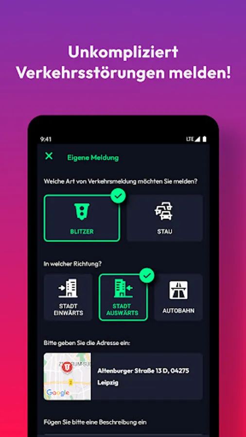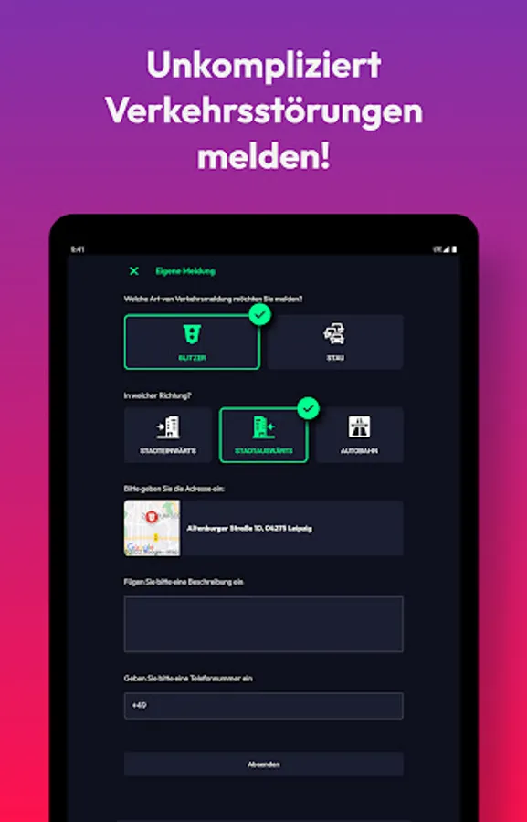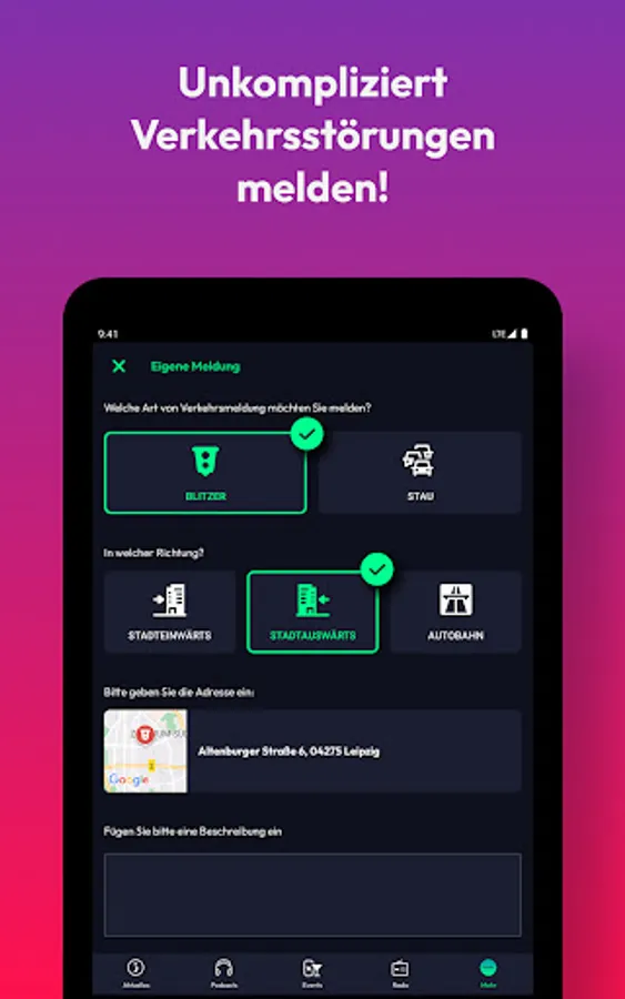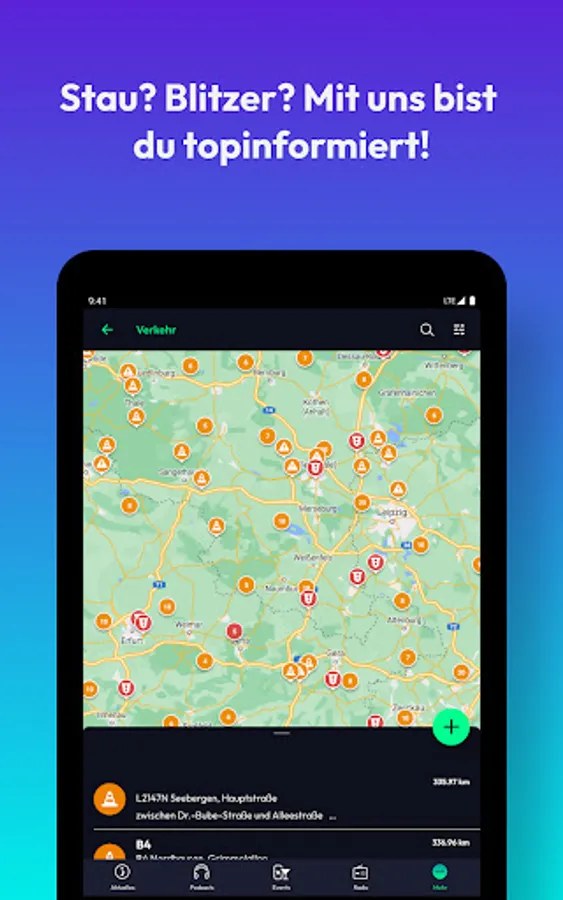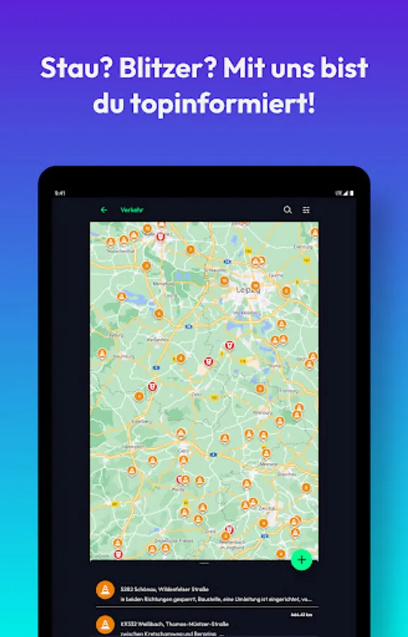 • Traffic: We report all current traffic jams and speed cameras, construction sites or disruptions: both live on a map and sorted by motorways. Did you discover a traffic jam or speed camera yourself? Then report it directly from the app.