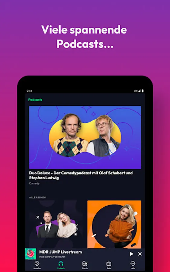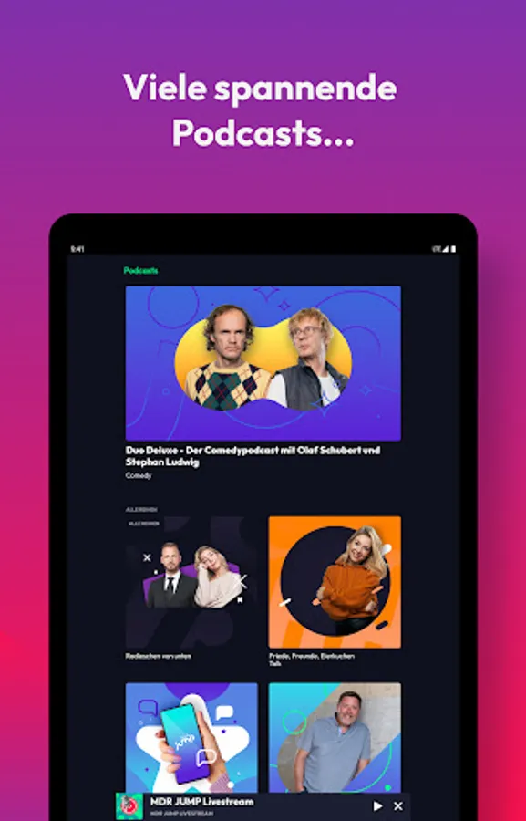 • Podcasts: With the MDR JUMP app you can listen to our podcasts on various topics anytime and anywhere: whether comedy, knowledge, regional stories, stars in interviews or advice in all areas of life. We offer you the full program.