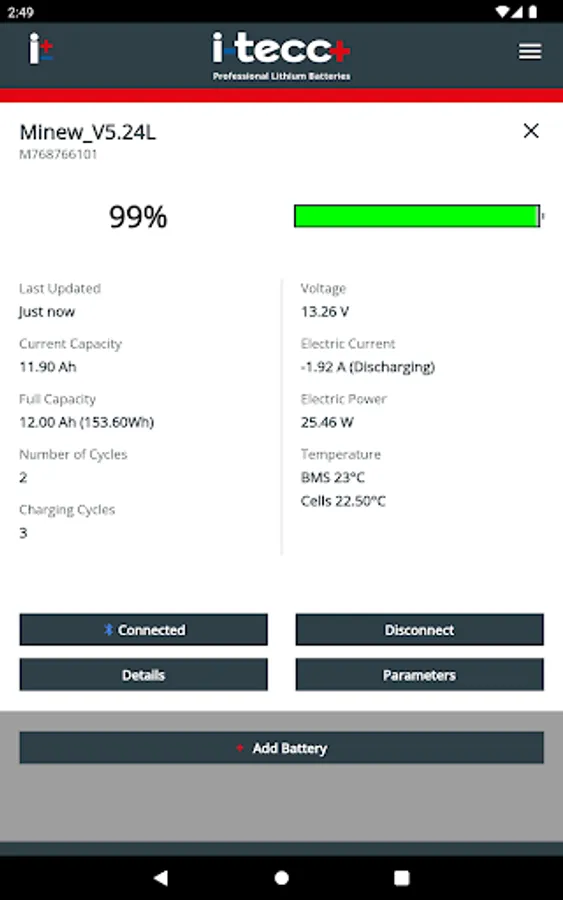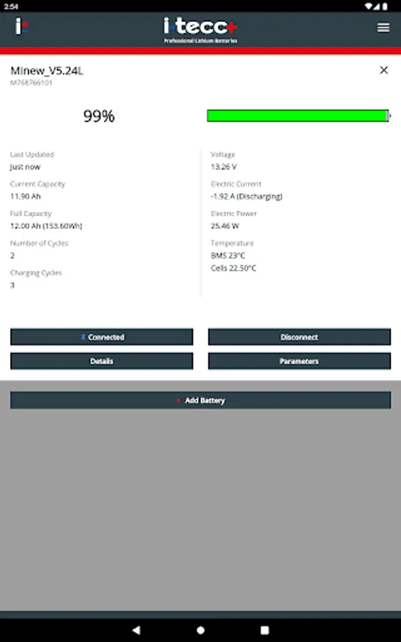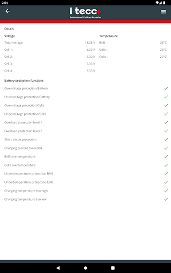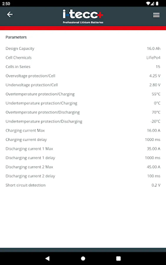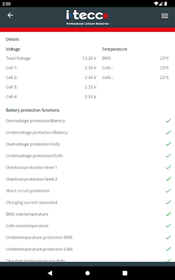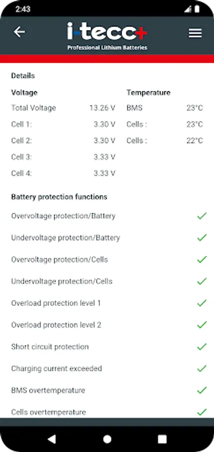 i-tecc+ BMS is the perfect tool to get important information about your i-tecc+ LiFePO4 batteries, such as current state of charge, battery capacity, power consumption, temperature, charge cycles and much more.