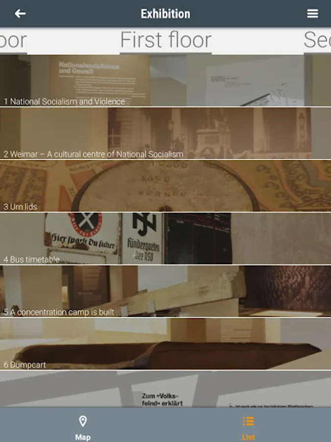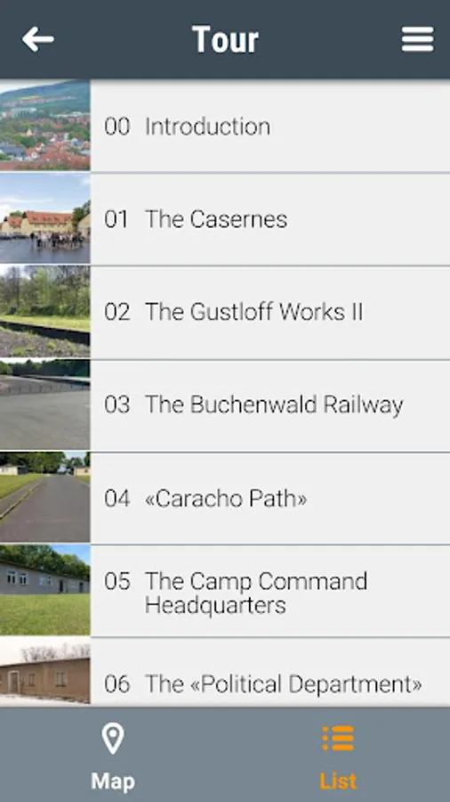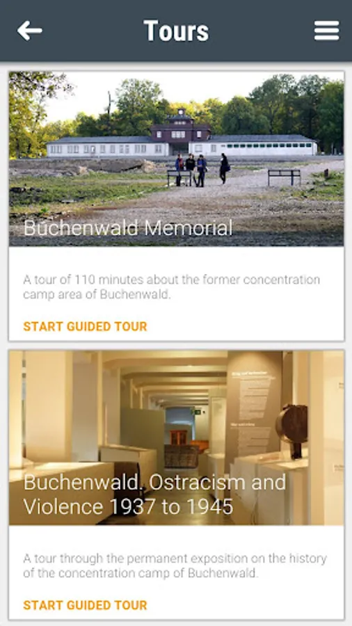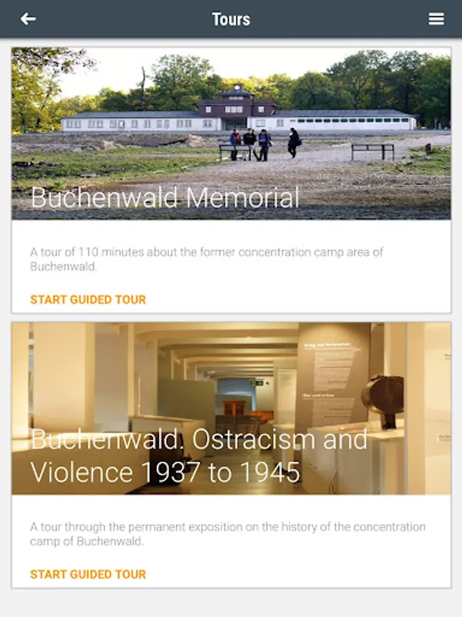 The app offers a tour of the former camp grounds and a tour of the permanent exhibition on the history of the Buchenwald concentration camp. In both cases, you can design the tour according to your individual preferences. On the camp grounds, the app provides basic information on 27 historically significant sites, supplemented with photographs from the memorial's extensive photo archive. In addition, former inmates talk about their experiences. The tour of the permanent exhibition "Buchenwald: Ostracism and Violence 1937 to 1945" features the main exhibition texts and provides explanations of selected objects. Biographies shed light on the fates of the inmates.