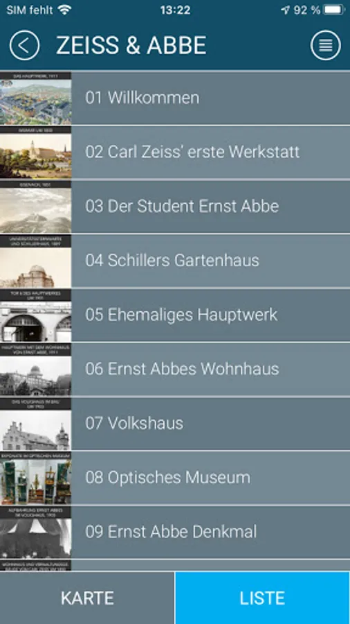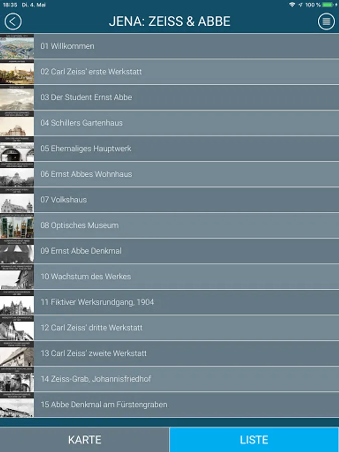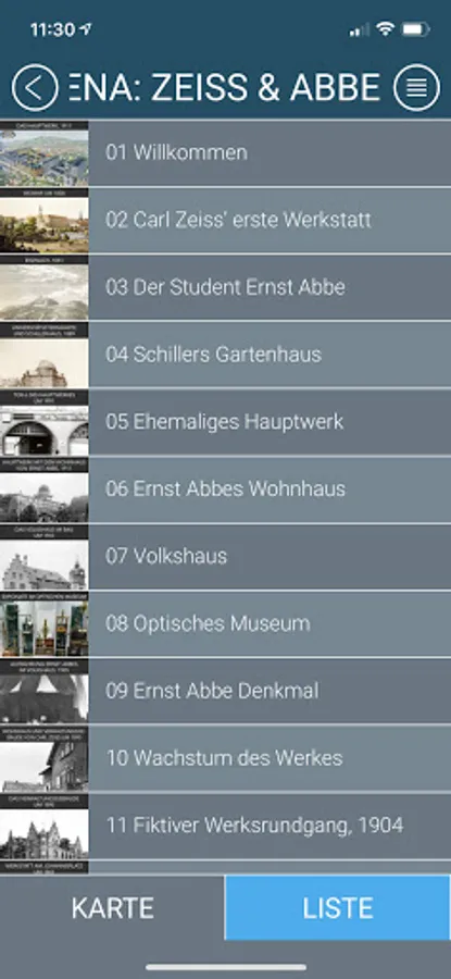 • Scrollable menu list displaying all the stops; individual stop selection possible• Several images for each stop provided as a slide show
