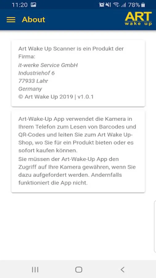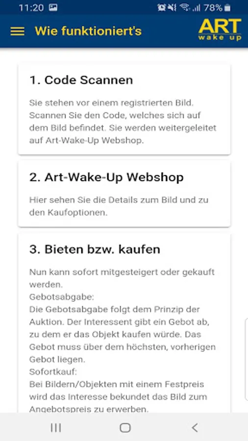 Art-wake-up provides an app and a management platform with a management tool. The objects are offered, described and priced via the platform. Art-Wake-Up creates a unique code for every object you set. By scanning this code using the Art-Wake-Up App, the prospect will be connected to the offer website. There he finds all the details about each object. He has the opportunity to buy immediately or submit a bid for the object. If the seller has set a minimum price, only higher bids can be made. The contract will be carried out in accordance with the criteria set by the seller.