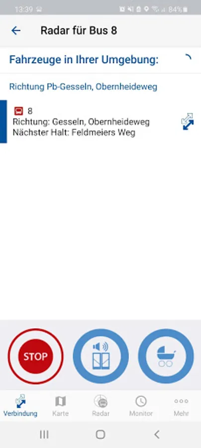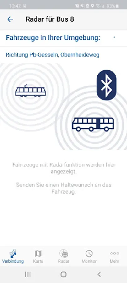 Incoming vehicles are recognized by the app and announced with line number and destination. On the way, the upcoming stops will be announced and you will be advised of changes and exits. The app can also be used to trigger a stop request, boarding assistance and a signal to locate the entrance door.