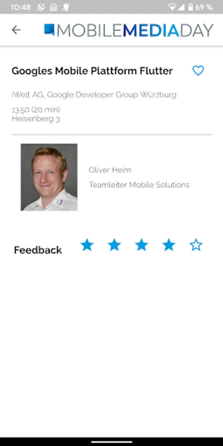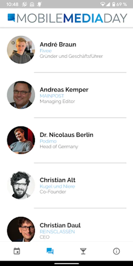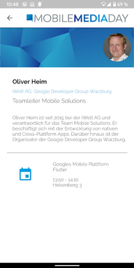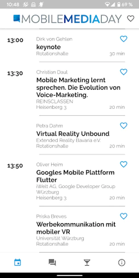 The Mobile Media Day conference app is your perfect companion on the day of the fair. In addition to a detailed schedule, you have access to the program with information about the speakers and partners of the event. At any time can be looked up, which lecture in which area is currently running and which start shortly.