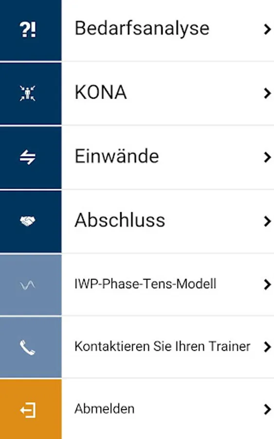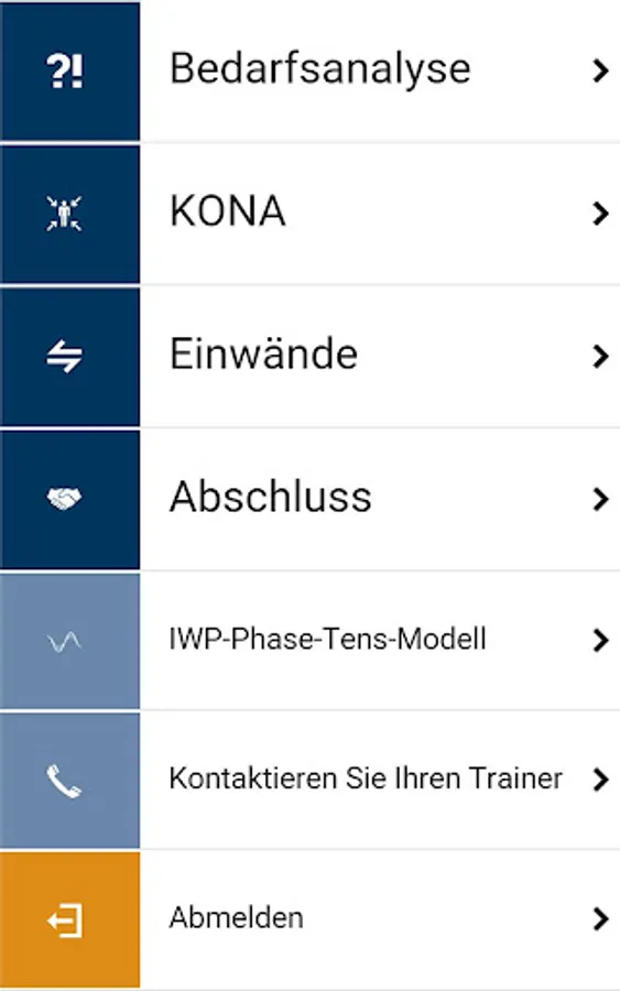 The sales of the app Institute of Business Education based on the IWP-sales phase-Tens model and supports the training sessions that can be created by selling points, which can be stored and looked inside the app.