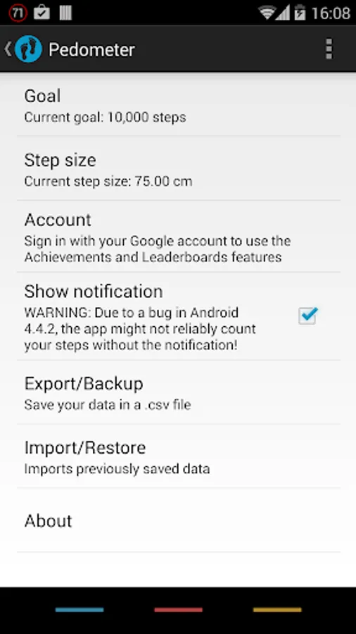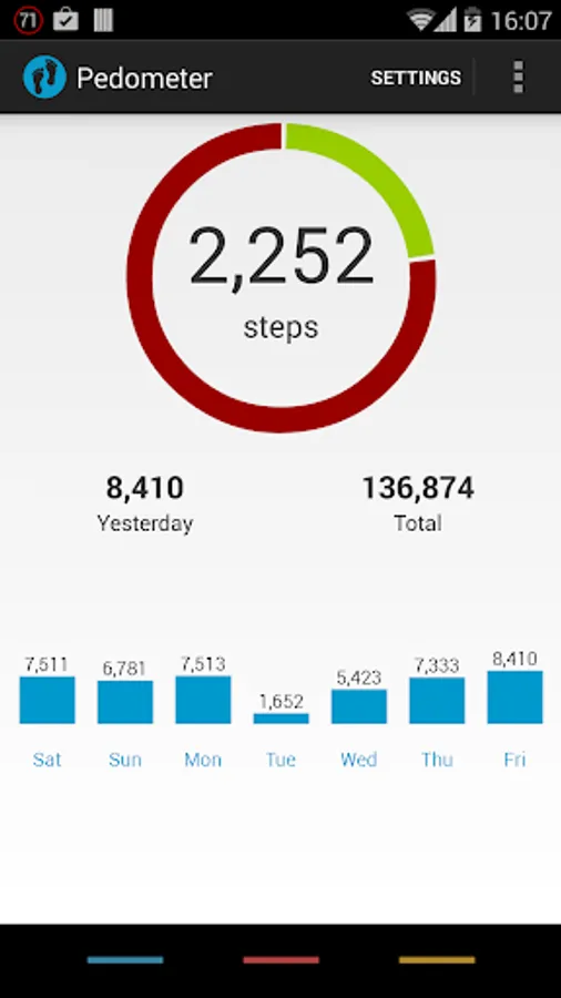 Lightweight pedometer app using the hardware step-sensor for minimal battery consumption.