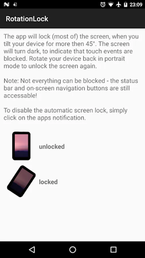 This app is kind of a lockscreen: It prevents accidental screen touches when the screen is on. It uses the devices rotation sensor to automatically lock or unlock the device: In portrait mode, you can use your device as usual but when tilted for more then 75° (in both directions), it will overlay the current screen with a touch-consuming fullscreen layer.