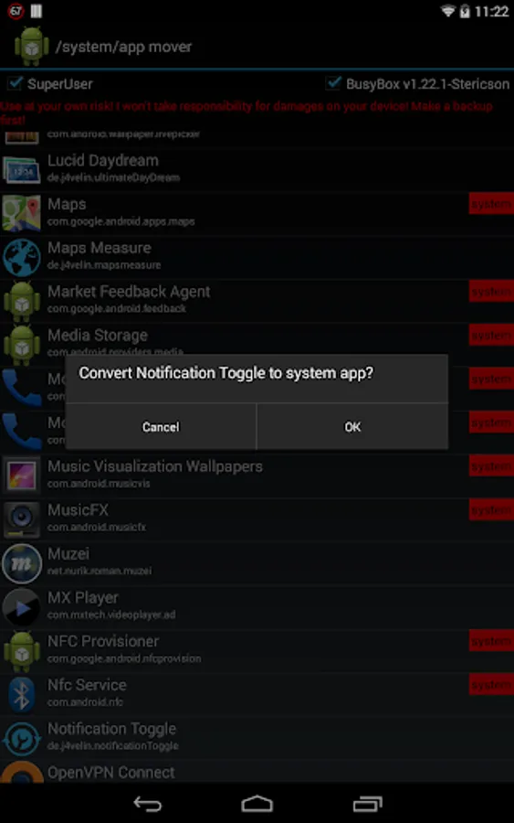 The app might not work on custom ROMs! On Android 5.0 and newer, system apps can not be converted to normal apps with this app! Feel free to contribute to the GitHub project if you know a fix for this.
