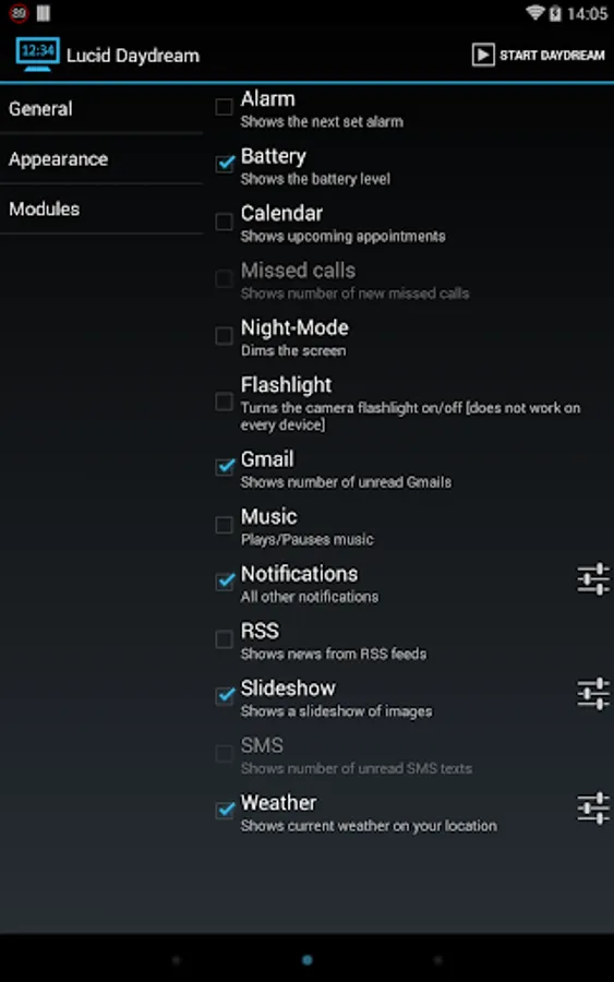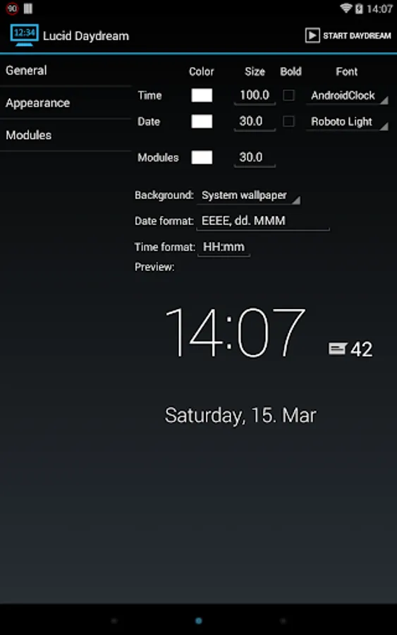 On Android 4.2+ you need to enable the "DayDream" in the Android display settings to use & configure the app! Note that the system won't start the daydream if you're display is kept awake! Make sure to disable the "Keep awake while charging" option in the Android developer settings (if you have enabled that before). On Samsung devices, make sure to disable the "keep display on while eye contact is detected" option (or how they call that)