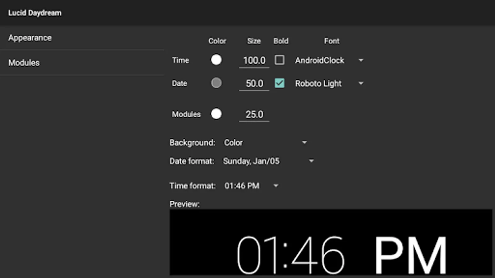 Lucid automatically starts when you put your device in the dock or when you charge it. The app is very customizable and comes with a lot of functionallity, like: