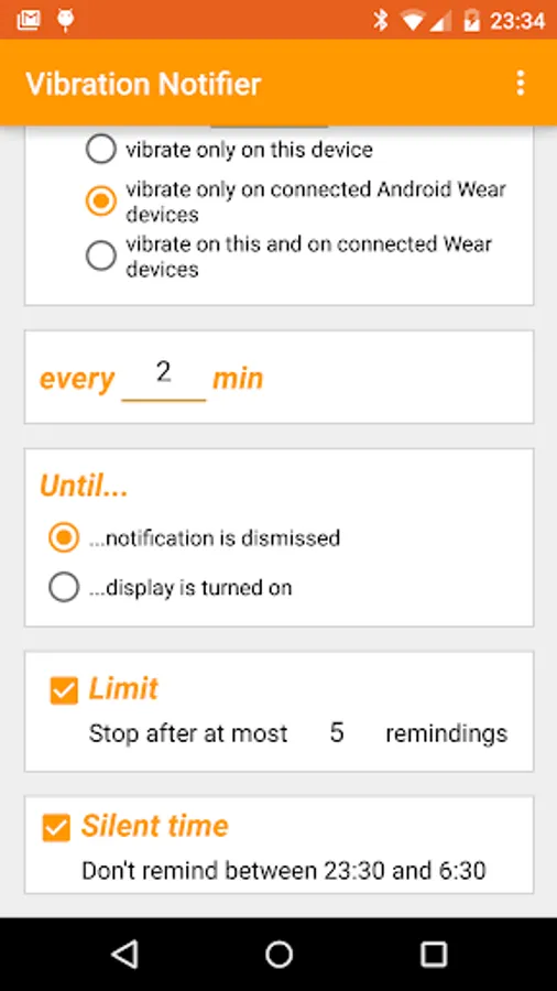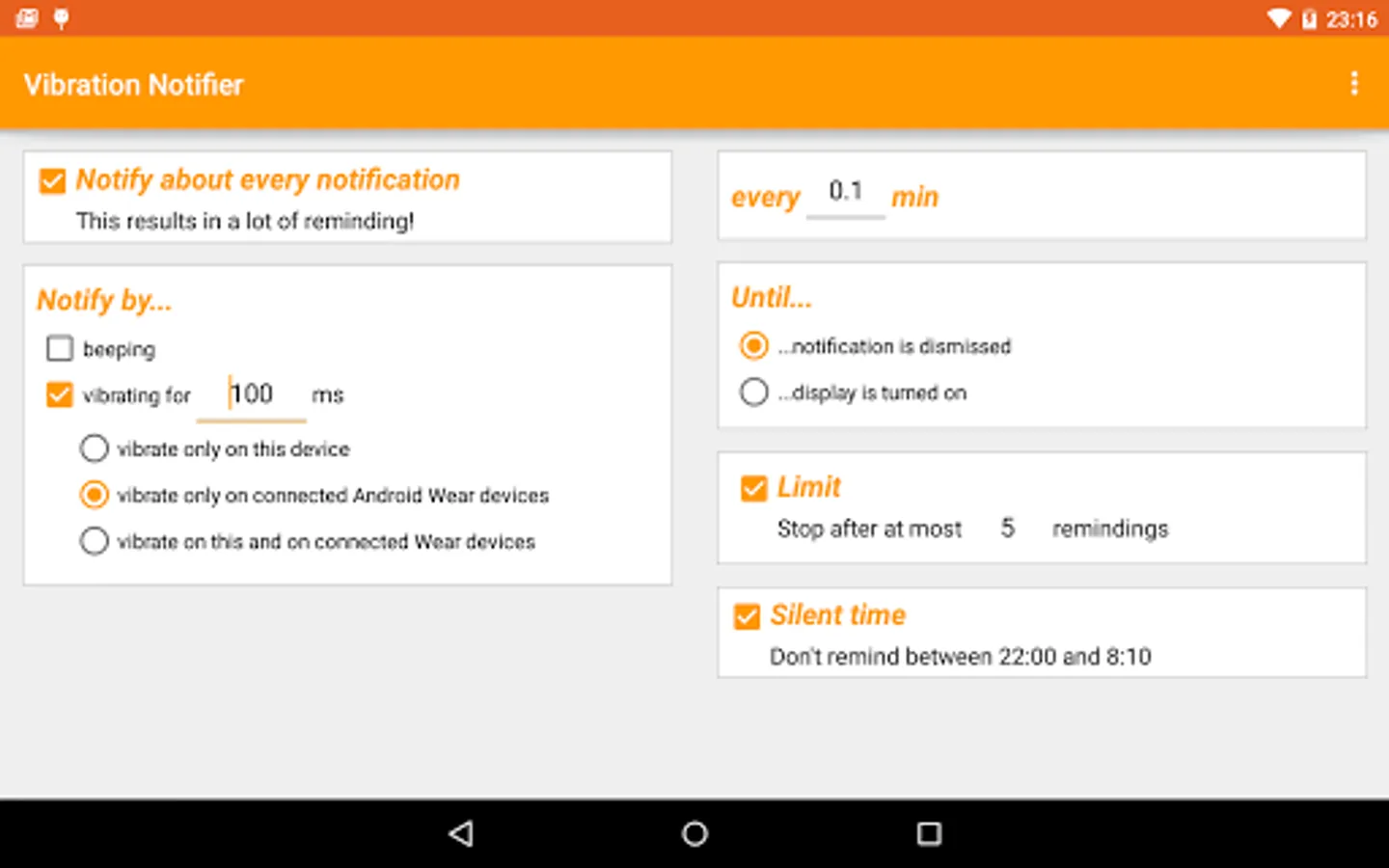 Silent hours: Please note that when you set up a silent hours interval in the app, only Vibration Notifier itself won't vibrate or beep. It does not mute other apps so if you receive a new mail, your Gmail app might still beep!
