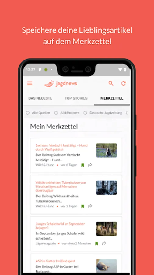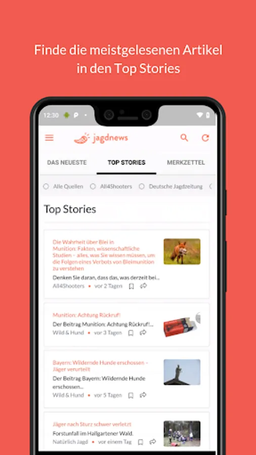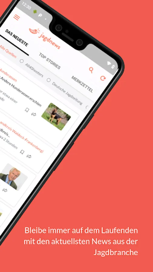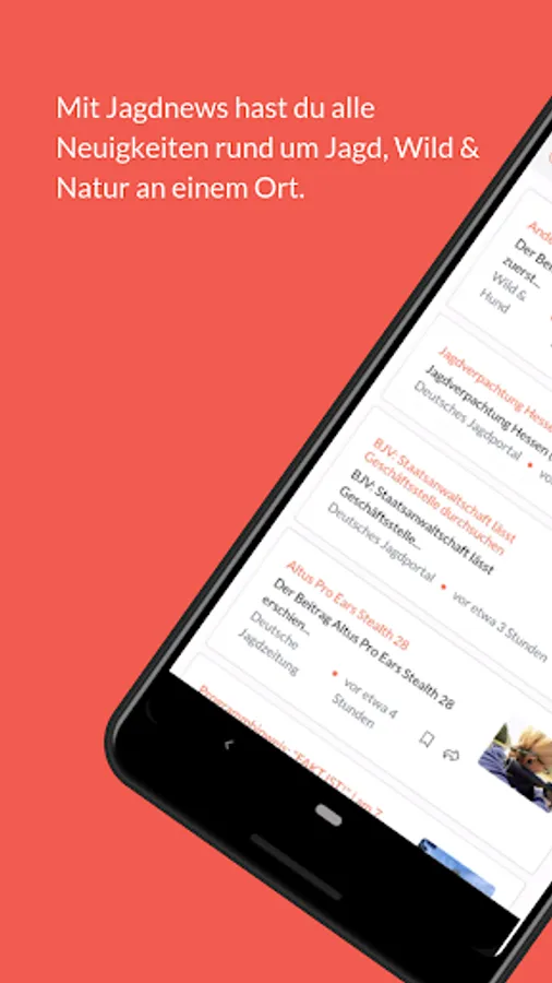 We search through relevant online magazines and portals (such as Wild & Hund, JÄGER magazine) and collect all the news in a clear order in the app. Scroll through the latest news, let the top stories show or filter specifically for individual sources. So you always stay up to date what happens in the world of hunting!