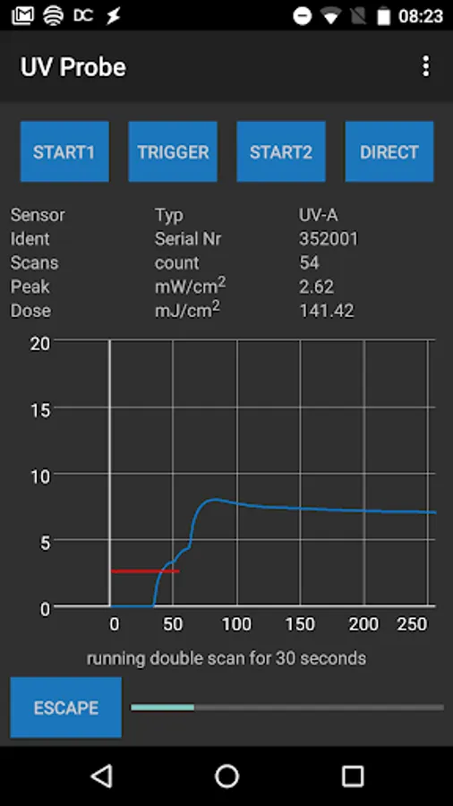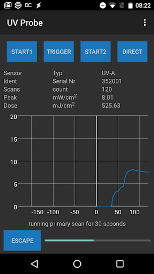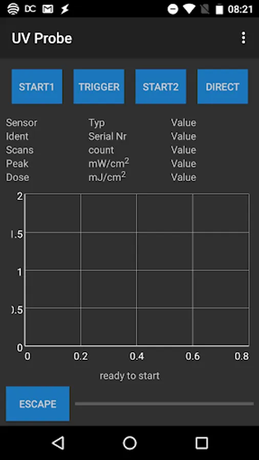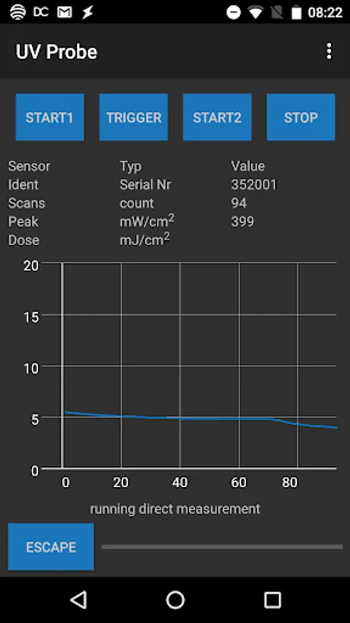 The UV-Probe sensor is USB operated via an ANDROID App. It is used to measure and display the UV energy in mW / cm². An additional feature is the sampling of the peak UV intensity in mW / cm² and the measurement of the UV dose in mJ / cm² over a predetermined period of 30/60/90 seconds. There are different sensor types. UV-A, UV-B, UV-C, UV-V, and UV-LED.
