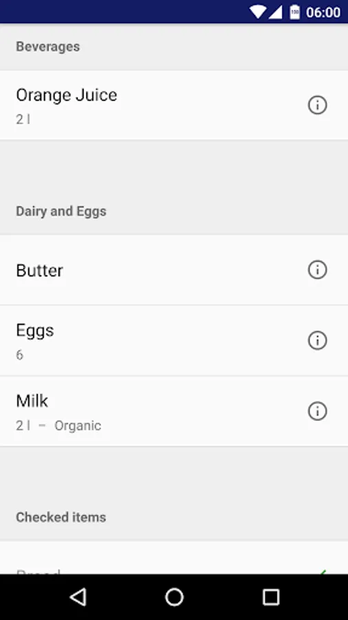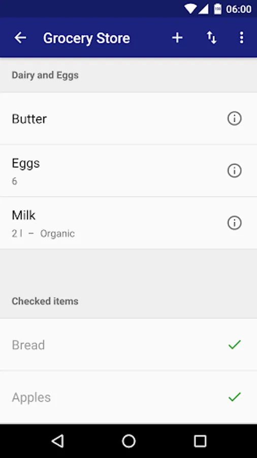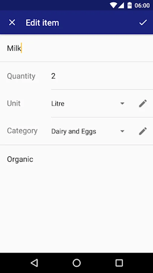 When the app already knows an item, that you want to add to a list, it can automatically group it with other items that belong to the same category. You can also specify the quantity and a unit for items and add a comment.