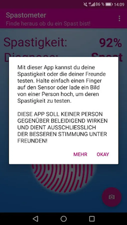 A gag on every party! All once put her finger on the screen or upload a photo of your face and you are diagnosed, what percentage you're a spaz. Of course, this app should offend any person opposite, but just a bit of fun in between :)