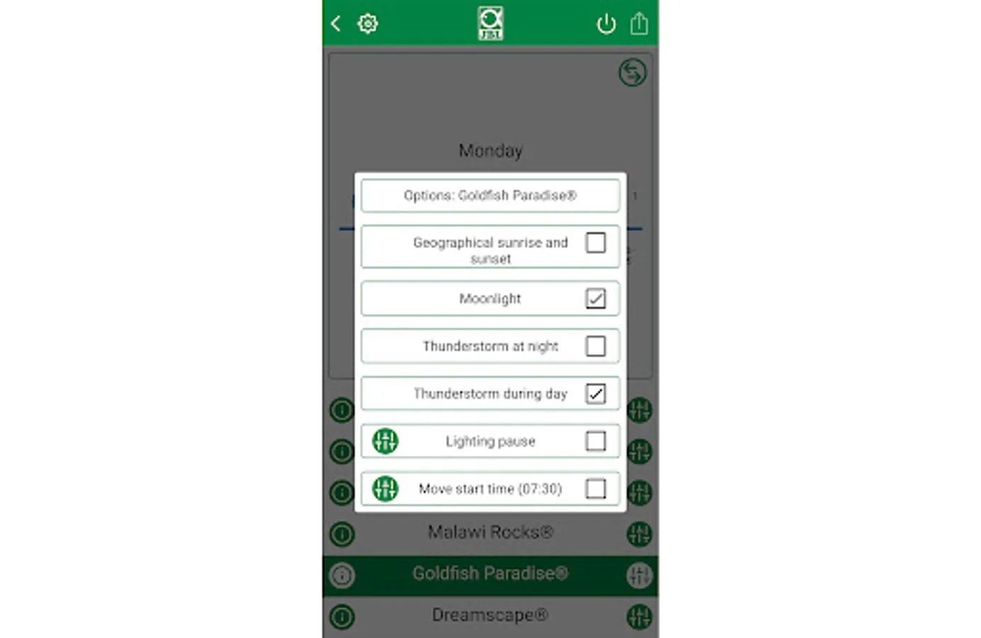 Geographically correct lighting data from South America (RioPantanal®), Africa (MalawiRocks®) and Southern China (GoldfishParadise®) can be selected.