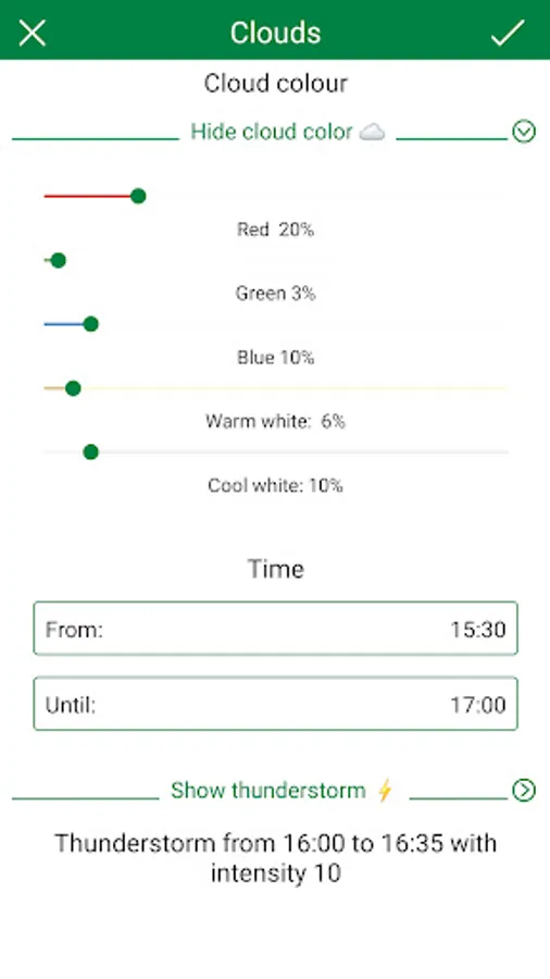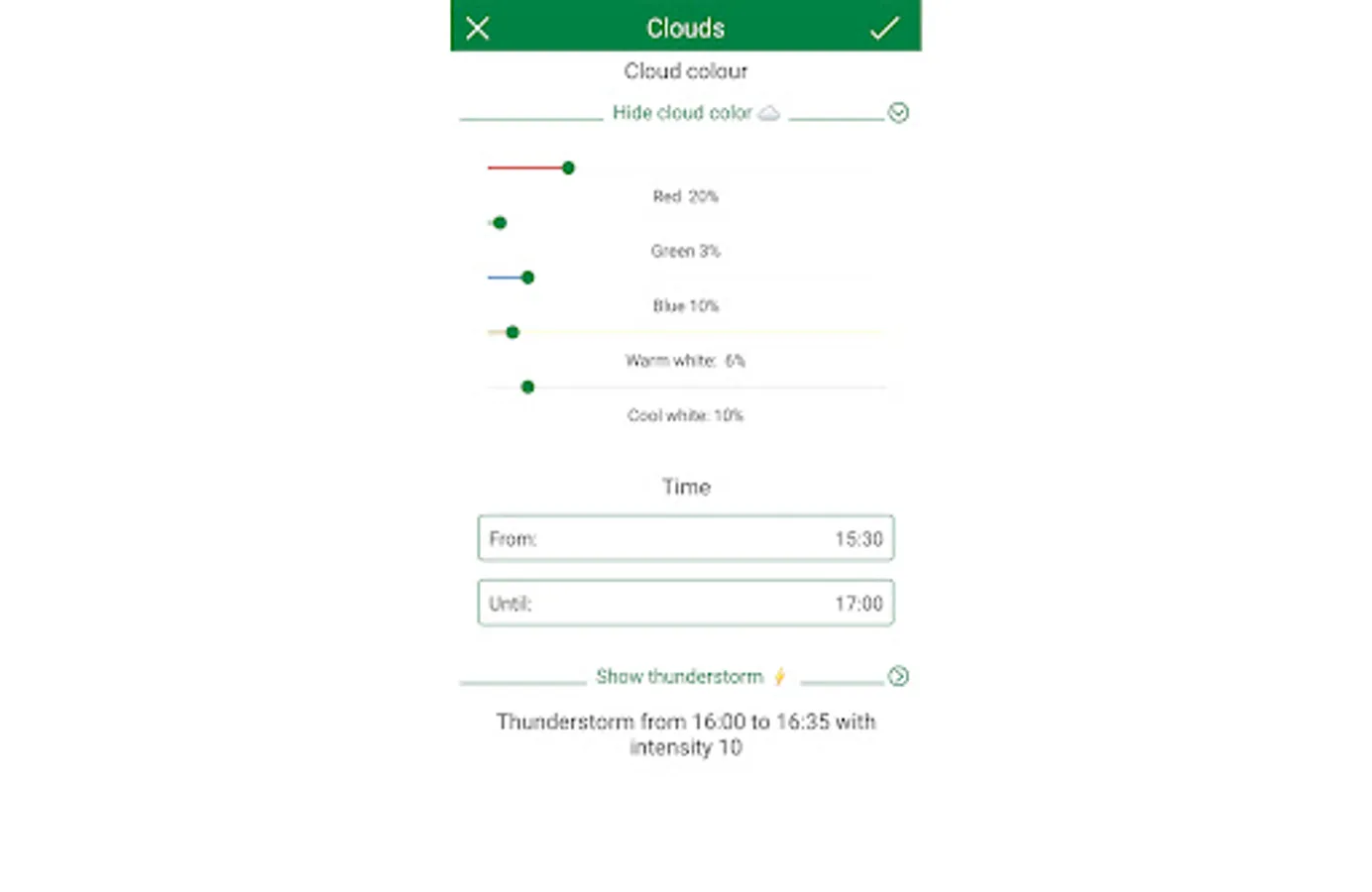 If you cannot find what you are looking for in this selection, you can create your own individual theme programme in manual mode, in all light colours, using functions for moonlight, clouds, lightning, sunrise and sunset.