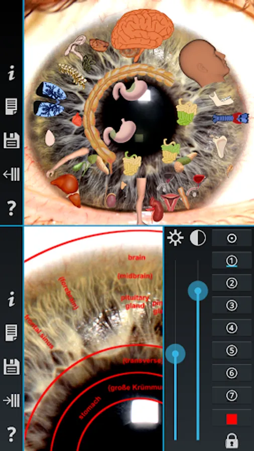 The apps "Miniris" and "Eye Diagnosis" support the visualization of eye photographs on an Android device, in order to do medical iris diagnosis. Both apps are limited to two weeks trial use.